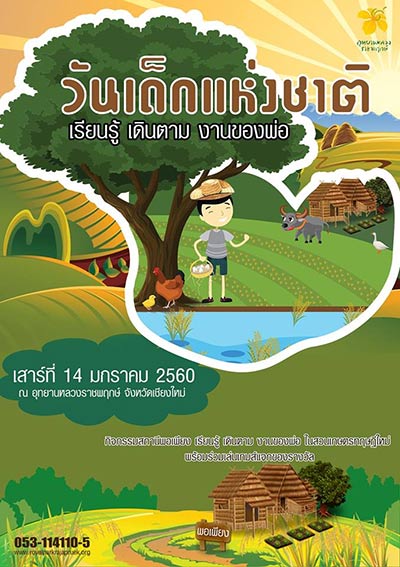 ขอเชิญน้อง ๆ ร่วมงานวันเด็กแห่งชาติ ประจำปี 2560 ภายใต้แนวคิด "เรียนรู้ เดินตาม งานของพ่อ" ในวันเสาร์ที่ 14 มกราคม 2560 เวลา 09.00-16.00 น. ณ สวนเกษตรทฤษฎีใหม่ อุทยานหลวงราชพฤกษ์ จังหวัดเชียงใหม่