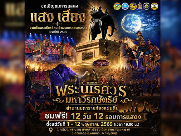 ชวนเที่ยวงานเทิดพระเกียรติสมเด็จพระนเรศวรมหาราช 2569 กาญจนบุรี ย้อนยุคสุดอลังการ แสง สี เสียงจัดเต็ม เที่ยวเพลินได้ทั้งครอบครัว