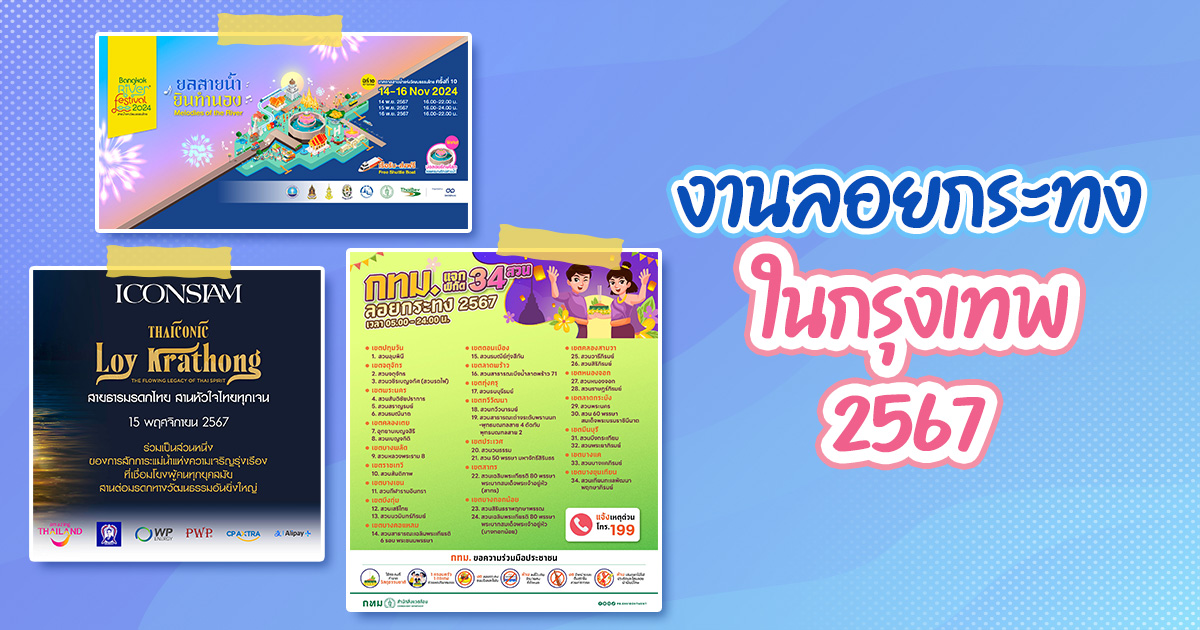 งานลอยกระทง 2567 กรุงเทพฯ รวมสถานที่จัดงานลอยกระทง สัมผัสเสน่ห์ประเพณีไทยริมแม่น้ำ คืนวันเพ็ญเดือนสิบสอง ลอยกระทง เป็นประเพณีไทยที่มีความงดงาม ซึ่งในปีนี้ตรงกับวันที่ 15 พฤศจิกายน โดยแต่ละจังหวัดก็ยังคงมีการจัดงานลอยกระทง 2567 ทั่วทุกภาค สำหรับในกรุงเทพฯ ก็มีสถานที่จัดงานลอยกระทงมากมายทั้งริมแม่น้ำเจ้าพระยาและอื่น ๆ ทำให้บรรยากาศของการลอยกระทง กรุงเทพ น่าประทับใจเป็นอย่างยิ่ง แต่จะมีที่ไหนบ้างนั้นตามมาเช็กลิสต์กันเลย กทม. เปิดสวนสาธารณะ 34 แห่ง ให้ลอยกระทง ตั้งแต่เวลา 05.00-24.00 น. จะมาเดี่ยว มาคู่ มาเป็นแก๊ง หรือครอบครัว ก็มาร่วมเทศกาลลอยกระทงสืบสานประเพณีที่สวนสาธารณะ กทม. ทั้ง 34 แห่ง กันได้เลย ทั้งนี้ กทม. ชวนคนกรุงใช้กระทงจากวัสดุธรรมชาติ โดยเลือกใช้กระทงที่ทำจากวัสดุธรรมชาติ, 1 ครอบครัว 1 กระทง, ลดขนาดกระทง, ลอยกระทงในแหล่งน้ำปิด และลอยกระทงออนไลน์ หรือถ้าใครอยากลอยกระทงแบบดิจิทัล รักษ์โลก ไม่ทำลายสิ่งแวดล้อม ขอขมาง่ายแค่ปลายนิ้ว ก็มีสถานที่จัดงาน ได้แก่ Skywalk สี่แยกปทุมวัน วันที่ 14-15 พฤศจิกายน 2567 ตั้งแต่เวลา 18.00-23.00 น. งาน “Eco-Lights of Tradition” ณ ลานคนเมือง เสาชิงช้า วันที่ 15 พฤศจิกายน 2567 ตั้งแต่เวลา 17.00-23.30 น. คิง เพาเวอร์ รางน้ำ และสวนสันติภาพ เขตราชเทวี วันที่ 15 พฤศจิกายน 2567 คลองโอ่งอ่าง วันที่ 13-15 พฤศจิกายน 2567 สอบถามข้อมูลเพิ่มเติมได้ที่เฟซบุ๊ก สำนักสิ่งแวดล้อม กทม., เฟซบุ๊ก กรุงเทพมหานคร เชิญร่วมงาน Bangkok River Festival 2024 เทศกาลสายน้ำแห่งวัฒนธรรมไทย “ยลสายน้ำ ยินทำนอง” เข้างานฟรี ! วันที่ 14-16 พฤศจิกายน 2567 ณ 10 ท่าน้ำร่วมสมัย ได้แก่ วัดโพธิ์, วัดอรุณฯ, วัดระฆังฯ, วัดกัลยาฯ, วัดประยูร, ท่ามหาราช, ยอดพิมาน ริเวอร์วอล์ค, เอเชียทีค เดอะ ริเวอร์ฟร้อนท์, สุขสยาม ณ ไอคอนสยาม และคลองโอ่งอ่าง-วัดบพิตรพิมุขฯ-ศาลรัฐธรรมนูญ พบกับกิจกรรมต่าง ๆ มากมาย ได้แก่ ลอยกระทงบ่อลอยรักษ์โลก รักษ์สายน้ำ ลดปัญหาขยะกระทงในแม่น้ำ เปิดโบสถ์ทำบุญ ลอยประทีปบูชา เสริมสิริมงคลให้กับชีวิต นุ่งโจง ห่มสไบ เสน่ห์ไทย ไม่เลือนหาย Melodies of The River การแสดง “โหมโรง 144 ปี หลวงประดิษฐไพเราะ” จัดเต็มมหกรรมการแสดงมหรสพ สืบสานมรดกวัฒนธรรมไทย หาชมยาก เปิดพื้นที่ใหม่ คลองโอ่งอ่าง-วัดบพิตรพิมุขฯ-ศาลรัฐธรรมนูญ ลอยกระทงเลียบคลอง เรียนรู้ประวัติศาสตร์พหุวัฒนธรรม อร่อยร้านเด็ด เสน่ห์อาหารชุมชน Bangkok River Festival 2024 x Awakening Bangkok เทศกาลงานไฟสุดอาร์ตกลางกรุง @ท่ายอดพิมานฯ เช็กอิน ชมงานศิลป์ระดับโลก BAB2024 ‘รักษา กายา’ (Nurture Gaia) เยาวชนเจ้าบ้าน สืบสานวัฒนธรรม บอกเล่าเรื่องราววิถีชุมชนริมแม่น้ำเจ้าพระยา รวมพลังจิตอาสา กิจกรรมแยกขยะกระ