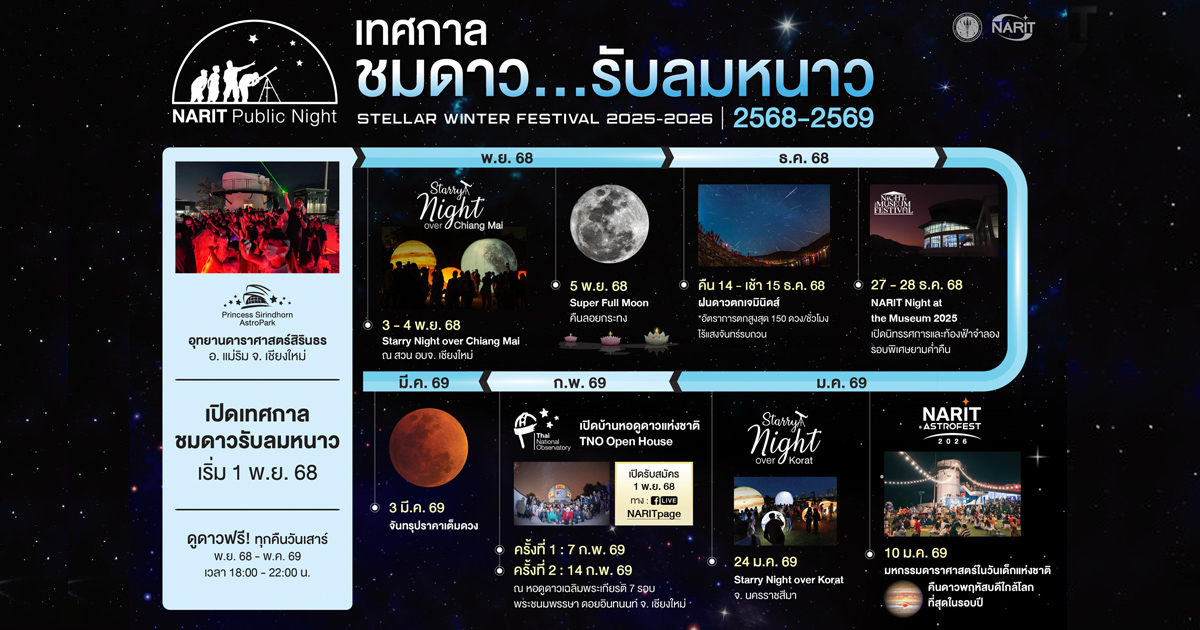 ต้อนรับลมหนาวกับ 10 อีเวนต์ดาราศาสตร์ ชวนคนรักท้องฟ้ามาชมดาว ดูฝนดาวตก และปรากฏการณ์บนฟากฟ้าที่หาชมได้ไม่บ่อย เตรียมกล้องให้พร้อม แล้วไปสัมผัสความงามของท้องฟ้ายามค่ำคืนกัน เมื่ออากาศเริ่มเย็นและท้องฟ้าเปิดชัดช่วงปลายปี ก็ถึงเวลาของเทศกาลชมดาวที่หลายคนรอคอย ปีนี้มีอีเวนต์ดาราศาสตร์น่าสนใจมากมาย ทั้งปรากฏการณ์บนฟ้า ฝนดาวตก และช่วงเวลาชมดาวพิเศษที่จัดทั่วประเทศ เหมาะสำหรับทั้งมือใหม่และสายดูดาวตัวจริงที่อยากออกไปสัมผัสความงามของท้องฟ้ายามค่ำคืน ท่ามกลางลมหนาวและบรรยากาศสุดโรแมนติกของปลายปี 2568 ต่อเนื่องถึงต้นปี 2569 เลยทีเดียว สถาบันวิจัยดาราศาสตร์แห่งชาติ (องค์การมหาชน) หรือ สดร. (NARIT) ภายใต้กระทรวงการอุดมศึกษา วิทยาศาสตร์ วิจัยและนวัตกรรม (อว.) ชวนคนไทยชมความงามของท้องฟ้ายามค่ำคืนในช่วงฤดูหนาว กับกิจกรรมใหญ่ประจำปี “เทศกาลชมดาว…รับลมหนาว” เริ่มตั้งแต่วันที่ 1 พฤศจิกายน 2568 เป็นต้นไป ดูดาวทุกคืนวันเสาร์พร้อมกัน 5 แห่งทั่วประเทศ ได้แก่ อุทยานดาราศาสตร์สิรินธร อ.แม่ริม จ.เชียงใหม่ หอดูดาวเฉลิมพระเกียรติฯ นครราชสีมา หอดูดาวเฉลิมพระเกียรติฯ ขอนแก่น หอดูดาวเฉลิมพระเกียรติฯ ฉะเชิงเทรา หอดูดาวเฉลิมพระเกียรติฯ สงขลา วันและเวลา : วันที่ 1 พฤศจิกายน 2568 ตั้งแต่เวลา 18.00-22.00 น. เปิดฤดูกาลดูดาวครั้งแรกของปีในธีม “Halloween Starry Night” ชวนแต่งกายฮาโลวีน ส่องดาวผ่านกล้องโทรทรรศน์หลากหลายขนาด พร้อมเสียงดนตรีบรรเลงตลอดคืน วันและเวลา : วันที่ 3-4 พฤศจิกายน 2568 ตั้งแต่เวลา 17.00-22.00 น. ธีม “Moon Night Party in the Park” เปิดประสบการณ์ดูดาวกลางสวน อบจ.เชียงใหม่ พบคาราวานกล้องโทรทรรศน์กว่าครึ่งร้อย และกิจกรรมดาราศาสตร์มากมาย วันและเวลา : วันที่ 5 พฤศจิกายน 2568 ตั้งแต่เวลา 18.00-22.00 น. ตรงกับ คืนวันลอยกระทง ชวนแต่งกายชุดไทยหรือพื้นเมือง ชมดวงจันทร์เต็มดวงใกล้โลกที่สุด พร้อมร่วมกิจกรรม “ลอยกระทงดิจิทัลในอวกาศ” *** จัดเฉพาะที่อุทยานดาราศาสตร์สิรินธร อำเภอแม่ริม จังหวัดเชียงใหม่ ส่วนภูมิภาคพบกันที่หอดูดาวเฉลิมพระเกียรติฯ นครราชสีมา ขอนแก่น ฉะเชิงเทรา และสงขลา วันและเวลา : วันที่ 14-15 ธันวาคม 2568 เริ่มชม 20.00 น. เป็นต้นไป ชวนร่วมนอนนับฝนดาวตก และชมวัตถุท้องฟ้าผ่านกล้องโทรทรรศน์ที่เชียงใหม่ และหอดูดาวเฉลิมพระเกียรติฯ นครราชสีมา ขอนแก่น ฉะเชิงเทรา และสงขลา วันและเวลา : วันที่ 27-28 ธันวาคม 2568 ตั้งแต่เวลา 18.00-22.00 น. เปิดนิทรรศการดาราศาสตร์ ท้องฟ้าจำลองรอบพิเศษยามค่ำคืน และกิจกรรมดูดาว พร้อมร่วมฉลองเทศกาลคริสต์มาสท่ามกลางหมู่ดาวพร่างพราวและลมหนาวปลายปี พร้อมกัน 5 แห่ง ณ อุทยานดาร