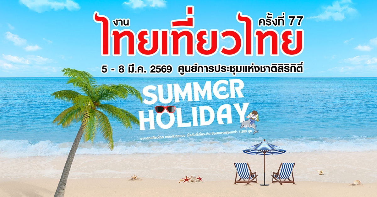 งานไทยเที่ยวไทย ครั้งที่ 77 พร้อมรวมดีลท่องเที่ยวสุดคุ้มและแรงบันดาลใจใหม่ ๆ ชวนออกมาเลือกแพ็กเกจ วางแผนทริป และค้นหาจุดหมายต่อไปได้ครบจบในงานเดียว งานไทยเที่ยวไทย ครั้งที่ 77 มหกรรมงานท่องเที่ยว ที่กลับมาสร้างบรรยากาศการเดินทางให้คึกคักอีกครั้ง ชวนทุกคนออกมาเติมแรงบันดาลใจในการท่องเที่ยว ไม่ว่าจะกำลังมองหาทริปพักผ่อน หรืออยากหาไอเดียเที่ยวใหม่ ๆ งานนี้คือจุดเริ่มต้นของการวางแผนเดินทางครั้งต่อไป สำหรับรายละเอียดการจัดงานเมื่อไหร่ ? วันไหน มาอัปเดตไปด้วยกันเลย ข้อมูลจากเฟซบุ๊ก งานไทยเที่ยวไทย แจ้งการจัดงานไทยเที่ยวไทย ครั้งที่ 77 และงานไทยเที่ยวนอก ครั้งที่ 6 วันที่ 5-8 มีนาคม 2569 เวลา 10.00-21.00 น. ณ ศูนย์การประชุมแห่งชาติสิริกิติ์ (Hall 5-7) สำหรับงานไทยเที่ยวไทย ครั้งที่ 77 และงานไทยเที่ยวนอก ครั้งที่ 6 ในครั้งนี้ ลดจัดหนัก ทุกบูธ ทุกเส้นทาง ไม่ว่าจะเที่ยวไทยหรือบินลัดฟ้า ก็มีมาให้ครบ ! โรงแรมสุดคุ้ม ตั๋วเครื่องบินราคาพิเศษ ทัวร์ & แพ็กเกจเที่ยวไทยและต่างประเทศ ดีลลับเฉพาะในงานเท่านั้น รายชื่อบูธผู้แสดงสินค้า : www.thaiteawthaifair.net/exhibitor-list/ บูธไฮไลท์สุดเด็ด : www.thaiteawthaifair.net/highlight-booth/ โปรโมชั่นบัตรเครดิตสุดพิเศษ : www.thaiteawthaifair.net/promotion/ ชวนมาเดินเที่ยวงานไทยเที่ยวไทย ครั้งที่ 77 ด้วยแรงบันดาลใจใหม่ ๆ ในการออกเดินทาง ใครพร้อมแล้ว ก็มาช้อปโปรโมชั่นท่องเที่ยวดี ๆ ด้วยกันเลย ^ ^ หมายเหตุ : ข้อมูลอาจมีการเปลี่ยนแปลงกรุณาตรวจสอบอีกครั้ง อัปเดตอีเวนต์และเทศกาลเดือนกุมภาพันธ์ 2569 ต้อนรับเดือนแห่งความรัก รวมที่เที่ยวเดือนกุมภาพันธ์ 2569 อากาศดี วิวสวย เที่ยวได้ทั่วไทย Thailand UFO Days เจาะลึกเรื่องลี้ลับและเทคโนโลยีจักรวาล ณ เขื่อนขุนด่านปราการชล งานว่าวนานาชาติพัทยา 2569 สีสันบนท้องฟ้าที่สายเที่ยวไม่ควรพลาด ขอบคุณข้อมูลและภาพจาก : เฟซบุ๊ก งานไทยเที่ยวไทย, เว็บไซต์ thaiteawthaifair.net