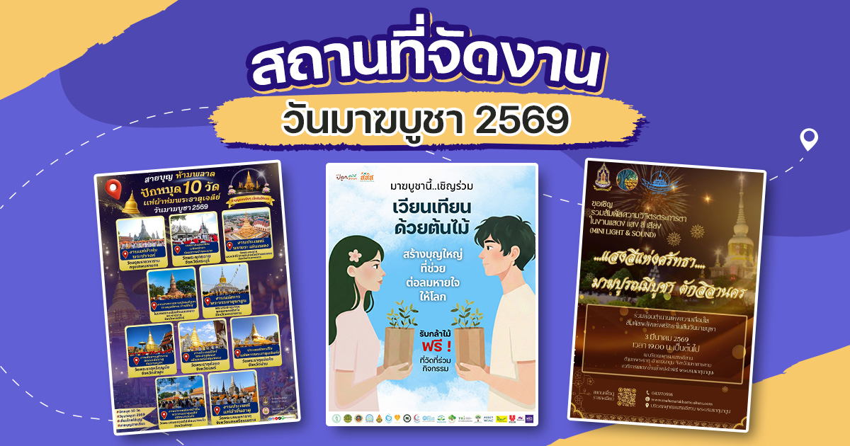 สถานที่จัดงานวันมาฆบูชา 2569 หลายวัดสำคัญจัดกิจกรรมเวียนเทียนและปฏิบัติธรรม บรรยากาศสงบ อิ่มบุญ อิ่มใจ หาโอกาสดี ๆ แล้วชวนครอบครัวไปเติมพลังใจในวันพระใหญ่กันสักครั้ง วันมาฆบูชา 2569 ปีนี้ตรงกับวันที่ 3 มีนาคม ถือเป็นอีกหนึ่งช่วงเวลาดี ๆ ที่ชวนให้เราออกเดินทางไปไหว้พระ ทำบุญ และร่วมกิจกรรมเวียนเทียน หลายสถานที่ทั่วไทยเตรียมจัดงานอย่างยิ่งใหญ่ เหมาะทั้งสายบุญและคนที่อยากหาโอกาสพักใจ เติมความอิ่มเอมในวันพระใหญ่ ใครที่เป็นสายบุญเตรียมให้พร้อม ว่าแต่มีสถานที่จัดงานวันมาฆบูชา 2569 ที่ไหนน่าสนใจ ไว้สายบุญตามมาเติมบุญกันได้เลย สายบุญห้ามพลาด กรมการศาสนา กระทรวงวัฒนธรรม ชวนท่องเที่ยว ทำบุญ ปักหมุด 10 วัด แห่ผ้าห่มพระธาตุเจดีย์ เนื่องในเทศกาลวันมาฆบูชา 2569 งานแห่ผ้าห่มพระปรางค์ วัดอรุณราชวราราม กรุงเทพฯ เทศกาลแสงเทียนแห่งศรัทธา น้อมถวายผ้าพระฉาย วัดพระพุทธฉาย จังหวัดสระบุรี งานประเพณีนบพระ เล่นเพลง วัดพระบรมธาตุ และหน้าที่ว่าการอำเภอเมืองกำแพงเพชร จังหวัดกำแพงเพชร งานเทศกาลมาฆปูรณมีบูชา ทะเลธุงอีสาน กาฬสินธุ์ โบราณสถานฟ้าแดดสงยาง พระธาตุยาคู จังหวัดกาฬสินธุ์ งานนมัสการพระบรมธาตุนาดูน พระบรมธาตุนาดูน พุทธมณฑลอีสาน จังหวัดมหาสารคาม งานสืบสานตำนานสองเจดีย์ธาตุ วันมาฆบูชา วัดพระธาตุหริภุญชัย จังหวัดลำพูน ประเพณีไหว้พระธาตุช่อแฮ เมืองแพร่แห่ตุงหลวง วัดพระธาตุช่อแฮ จังหวัดแพร่ ประเพณีหกเป็ง นมัสการพระธาตุแช่แห้ง วัดพระธาตุแช่แห้ง จังหวัดน่าน งานประเพณีแห่ผ้าขึ้นธาตุ พระบรมธาตุเจดีย์เขียนบางแก้ว วัดพระบรมธาตุเจดีย์เขียนบางแก้ว จังหวัดพัทลุง งานประเพณีแห่ผ้าขึ้นธาตุ วัดพระมหาธาตุ จังหวัดนครศรีธรรมราช สอบถามข้อมูลเพิ่มเติมได้ที่เฟซบุ๊ก กรมการศาสนา กรมการศาสนา กระทรวงวัฒนธรรม ร่วมกับ วัดอรุณราชวราราม เชิญร่วมงานวันมาฆบูชา 2569 วันที่ 3 มีนาคม 2569 ตั้งแต่เวลา 07.00 น. เป็นต้นไป ณ วัดอรุณราชวราราม เขตบางกอกใหญ่ กรุงเทพฯ พบกับไฮไลต์กิจกรรมอิ่มบุญ อิ่มใจภายในงาน ร่วมพิธีเจริญพระพุทธมนต์ และทำบุญตักบาตรพระสงฆ์ยามเช้า เวียนเทียนรอบพระปรางค์วัดอรุณฯ ร่วมขบวนแห่ห่มผ้าพระปรางค์ เสริมความเป็นสิริมงคลให้ชีวิต พิเศษสุด ! สายกิจกรรมต้องชอบ Walk Rally ตามรอยสักการะ 5 สิ่งศักดิ์สิทธิ์ภายในวัดอรุณฯ ทำภารกิจครบ แลกรับของมงคลที่ระลึกกลับบ้านไปเลย ร่วมเวียนเทียนด้วยต้นไม้ ทำบุญวิถีใหม่ ที่ช่วยต่อลมหายใจสะอาดให้โลก รับกล้าไม้เพื่อเวียนเทียนได้ฟรี ! ที่กว่า 300 วัดที่ร่วมกิจกรรม ดูรายชื่อวัดได้ที่ https://bit.ly/maka69 สอบถามข้อมูล