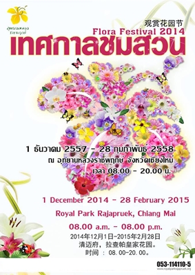 ขอเชิญนักท่องเที่ยวร่วมสัมผัสช่วงเวลาแห่งความประทับใจกับดอกไม้นานาพรรณตลอด 90 วัน ในเทศกาลชมสวน (Flora Festival 2014) ระหว่างวันที่ 1 ธันวาคม 2557-28 กุมภาพันธ์ 2558 ตั้งแต่เวลา 08.00-20.00 น. ณ อุทยานหลวงราชพฤกษ์ จังหวัดเชียงใหม่