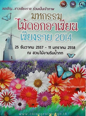 ขอเชิญทุกท่านร่วมงาน “มหกรรมไม้ดอกอาเซียนเชียงราย” ระหว่างวันที่ 25 ธันวาคม 2557-11 มกราคม 2558 ณ สวนไม้งามริมน้ำกก ใกล้สนามบินแม่ฟ้าหลวงเชียงราย ลองไปสัมผัสหมู่มวลดอกไม้ท่ามกลางลมหนาว ชื่นชมวัฒนธรรมชนเผ่าสีสันแห่งเชียงราย สักการะพระบรมสารีริกธาตุจากประเทศภูฏาน ขอพรปีใหม่เพื่อความเป็นสิริมงคลแก่ชีวิต พร้อมตื่นตากับขบวนบุพชาติทางน้ำแห่งเดียวในประเทศไทย พิธีเปิดสุดยิ่งใหญ่ตระการตาและกิจกรรมอื่น ๆ อีกมากมาย