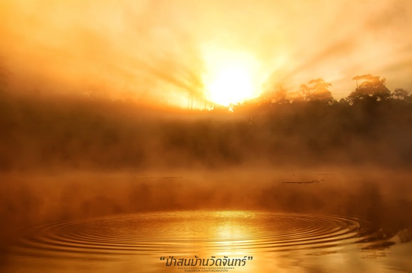 ดวงตะวันที่ค่อย ๆ ทะยานสูงขึ้นเรื่อย ๆ ส่องแสงสาดลงมาเบื้องล่างยังผืนน้ำ พร้อมไอหมอกที่จับตัวกันหนายิ่งทำให้เห็นได้ชัดถึงลำแสงที่ถูกพาดผ่านทะลุมาจากแนวไม้ผืนป่าด้านหน้า