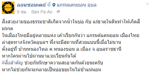 แกรนด์แคนยอนอุบลฯ แลนด์มาร์กแห่งใหม่ที่กำลังฮือฮาในขณะนี้ ชาวเน็ตคาดน่าจะเกิดจากการขุดดินไปขาย พร้อมฝากเตือนนักท่องเที่ยวช่วยรักษาความสะอาด