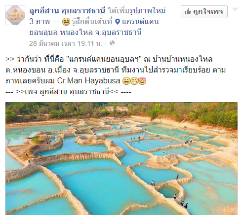 กลายมาเป็นที่ฮือฮาในโลกออนไลน์ขึ้นมาทันที หลังจากเมื่อวันที่ 28 มีนาคม 2559 ทางเพจ ลูกอีสาน อุบลราชธานี ได้มีการเผยแพร่ภาพบ่อน้ำสีฟ้าสด จากบ้านหนองไหล ตำบลหนองขอน อำเภอเมือง จังหวัดอุบลราชธานี ออกมาให้ชาวเน็ตได้ชมกัน โดยระบุว่าสถานที่ดังกล่าวได้รับการขนานนามว่าเป็น "แกรนด์แคนยอนอุบลฯ" ด้วยความสวยงามของบ่อน้ำซึ่งมีสีฟ้าใสตามภาพ ไม่ได้ผ่านการย้อมสีหรือตัดต่อภาพแต่อย่างใด