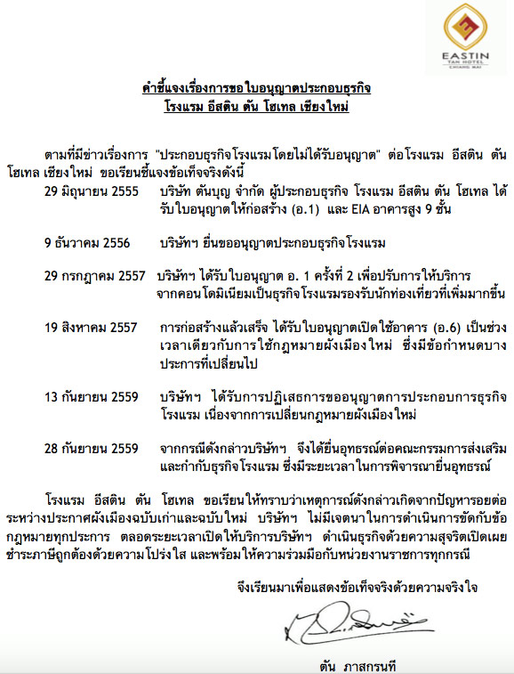 ตัน ภาสกรนที แถลงชี้แจงข่าว โรงแรมอีสติน ตัน โฮเทล เชียงใหม่ ถูกบุกจับเหตุไม่ได้ขออนุญาตประกอบการอย่างถูกต้อง ยันดำเนินธุรกิจด้วยความสุจริต โปร่งใส พร้อมให้ความร่วมมือกับหน่วยงานราชการทุกกรณี