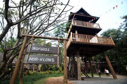 สัมผัสความงามของสถาปัตยกรรมพื้นถิ่นอีสานที่ได้รับการรวบรวมและสร้างขึ้นไว้มากที่สุด อาทิ สิม หอไตร หอกลอง เฮือนอีสาน เรือนไทยวน รวมทั้ง "เรือนนางเผอะ" เรือนโคราชที่ได้รับรางวัลอนุรักษ์ศิลปสถาปัตยกรรมดีเด่น ประจำปี พ.ศ. 2558 จากสมาคมสถาปนิกสยามในพระบรมราชูปถัมภ์ และอื่น ๆ พร้อมให้ท่านเพลิดเพลินกับอาหารอีสานพื้นบ้านหลากหลายเมนูในบรรยากาศครึกครื้นด้วยดนตรีและการแสดงพื้นบ้านอีสาน ก่อนเดินเล่นตามเส้นทางผจญภัยริมน้ำหรือนั่งรถชมความงามก่อนจะไปสู่จุดท่องเที่ยวจุดต่อไป