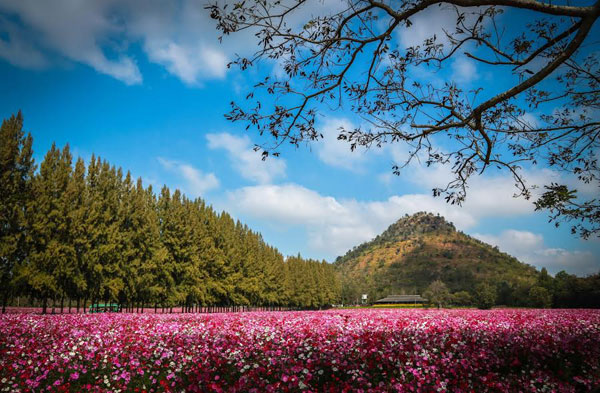 ดื่มด่ำกับบรรยากาศธรรมชาติด้วยทิวทัศน์ภูเขาพญาปราบและอ่างเก็บน้ำลำสำลาย ตระการตากับทุ่งดอกไม้หลากสีที่บานสะพรั่งอวดสีสันสวยงาม ร่วมเก็บภาพน่าประทับใจท่ามกลางสวนกุหลาบกว่า 5,000 ต้น ทุ่งทานตะวัน ทุ่งดาวกระจาย และทุ่งตารางดอกไม้หลากสี หรือหากท่านใดอยากหามุมถ่ายรูปไม่ซ้ำใครต้องมาที่เขาวงกตผ้าขาวม้าเพื่อเก็บภาพทุ่งดอกไม้มุมสูงแบบ 360 องศา