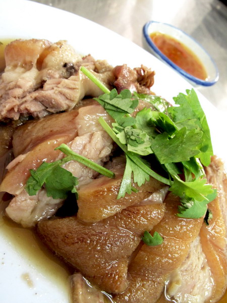 ส่วนถ้าใครที่ชอบกินขาหมู แต่ก็แอบกลัวไขมันจะพอกเส้นเลือด ต้องเดินเลยมาที่หน้าธนาคารออมสิน ตรงปากซอยเพชรสมุทรค่ะ เพราะที่นั่นมี "ร้านข้าวขาหมูออมสิน" ที่เปิดตั้งแต่ตี 5 – 11 โมง แต่พอสัก 10 โมงครึ่ง ก็เหลือขาหมูอยู่นิด ๆ หน่อย ๆ แล้ว ขายดีแบบนี้เพราะอาปาเจ้าของร้านมีเคล็ดลับที่น่าจะมัดใจสาว ๆ ละแวกนั้นที่อยากกินแต่ก็กลัวอ้วนได้เป็นอย่างดี เคล็ดลับนั้นคือ อาปาจะเลาะเอามันที่ติดอยู่ตามเนื้อและหนังขาหมูออกจนหมด จนได้เนื้อเพียวๆ และหนังหมูบาง ๆ ไม่มีไขมันติดอยู่ให้ลำบากใจ วิธีนี้อย่างน้อย ๆ ก็น่าจะช่วยให้คนกินรู้สึกผิดน้อยลงได้นะคะ (ข้าวขาหมูจานละ 25 -30 บาท)