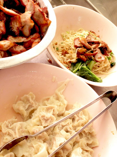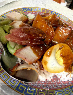 ร้านสุดท้ายที่เราจะแวะกันคือ “เม้งีข้าวหมูแดง” ที่มาแปลกด้วยการเสิร์ฟข้าวหมูแดง ข้าวหน้าเป็ด และข้าวหน้าไก่ย่างมาพร้อมกับน้ำจิ้มเต้าเจี้ยวพริกตำแบบเดียวกับที่กินกับข้าวมันไก่ แถมยังเอาผักบุ้งลวกที่เอาไว้กินกับข้าวหน้าเป็ด มาแนมให้กินกับข้าวหมูแดงด้วยค่ะ ก็เป็นการผสมผสานที่ออกจะแปลกอยู่สักหน่อยสำหรับคนที่คุ้นชินข้าวหมูแดง ข้าวหน้าเป็ด แบบที่เรากินกันอยู่ตามปกติ แต่ก็อร่อยดีค่ะ และสิ่งที่ยืนยันว่าร้านนี้อร่อยเด็ดจริงๆ ก็คือลูกค้าที่ยืนรอหน้าเมนูที่ตัวเองสั่งอยู่ด้านหน้าร้าน รวมทั้งลูกค้าที่นั่งกินอยู่ในร้านก็ไม่เคยพร่องลงเลย อาปาเจ้าของร้านเล่าให้ฟังว่าแกสืบทอดกิจการมาจากเตี่ย ที่พายเรือขายข้าวหมูแดงมากว่า 60 ปี และยังคงไว้ซึ่งเคล็ดวิชาที่เตี่ยถ่ายทอดมา นั่นคือจะใช้เตาถ่านเคี่ยวน้ำจิ้มไปอย่างใจเย็นจนได้น้ำจิ้มรสเด็ดที่ลูกค้าติดใจนั่นแหละค่ะ ร้านเปิดตั้งแต่ 06.00 – 15.00 น. (แต่เจ้าของร้านต้องตื่นขึ้นมาเตรียมของตั้งแต่ตี 3 แน่ะค่ะ) ทุกอย่างราคา 25 - 30 บาท