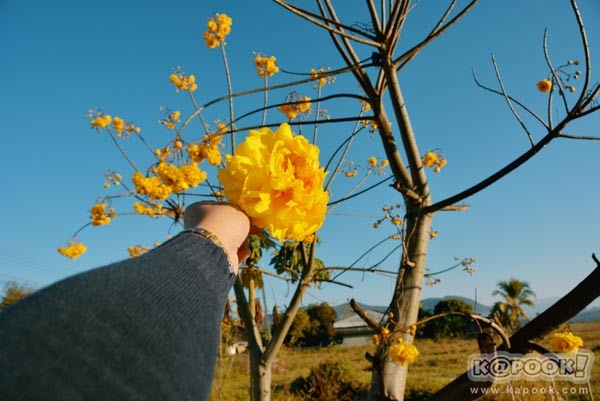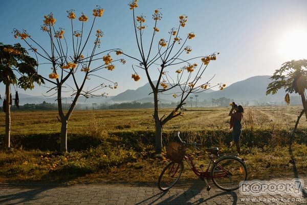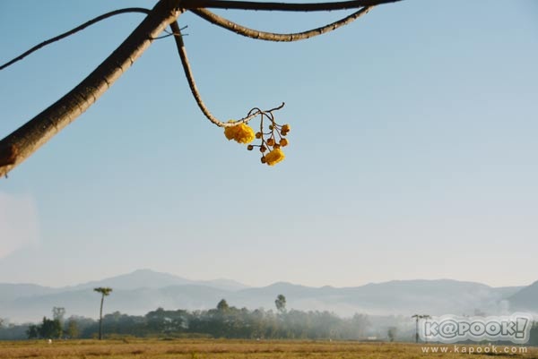จากที่เมื่อวานตอนเย็นเราแอบจ้องต้นสุพรรณิการ์หรือฝ้ายคำในภาษาเหนือ ซึ่งอยู่ริมถนนในหมู่บ้านกันเอาไว้ เช้านี้ก็เลยจะขี่จักรยานย้อนเข้าไปในหมู่บ้านเพื่อไปถ่ายรูปเล่นกันค่ะ