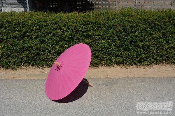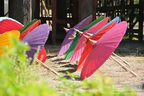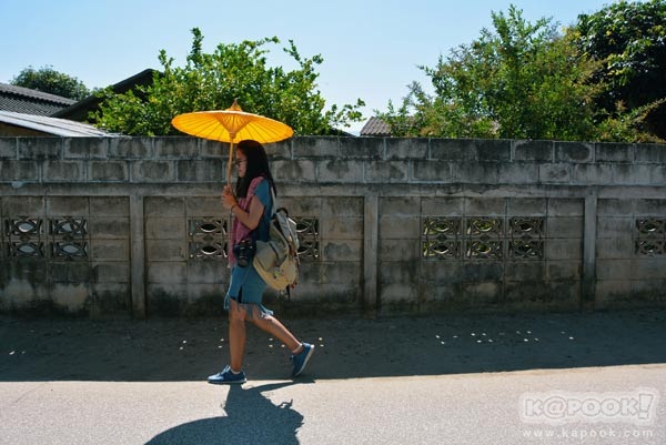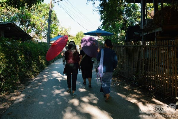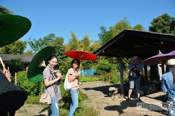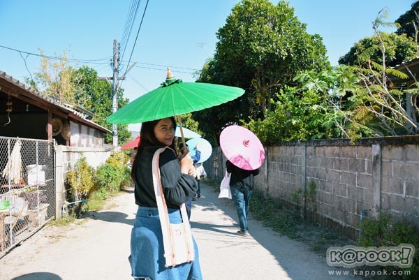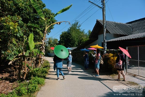 พอสายหน่อยเราก็เริ่มเดินเที่ยวชมหมู่บ้านกันค่ะ โดยมีแม่ ๆ (ชาวบ้านในท้องถิ่น) มาพาเดินเที่ยวชมค่ะ แต่ก่อนจะไปเที่ยวกันก็มีการแจกอุปกรณ์กันแดดสักหน่อย เป็นร่มพื้นเมืองของชาวเชียงใหม่ สีสันสดใส ใช้เป็นพร็อพถ่ายภาพได้อีกต่างหาก