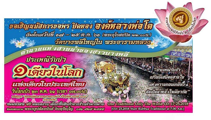 ในปีนี้ประเพณีรับบัว 2561 สมุทรปราการ นมัสการขอพร ปิดทอง องค์หลวงพ่อโต มีขึ้นระหว่างวันที่ 17-25 ตุลาคม 2561 (พระอุโบสถปิด 22.00 น.) วันโยนบัว คือวันที่ 23 ตุลาคม 2561 (เวลา 07.00 น.) ณ วัดบางพลีใหญ่ใน พระอารามหลวง ตำบลบางพลีใหญ่ อำเภอบางพลี จังหวัดสมุทรปราการ พร้อมกับกิจกรรมต่าง ๆ มากมาย ดูรายละเอียดเพิ่มเติมได้ที่ เฟซบุ๊ก วัดบางพลีใหญ่ใน พระอารามหลวง