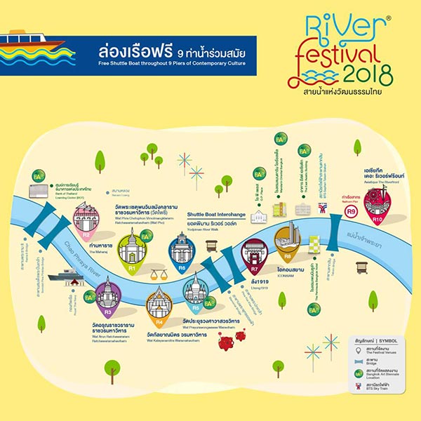River Festival 2018 เทศกาลสายน้ำแห่งวัฒนธรรมไทย ครั้งที่ 4 "สุข แสง ศิลป์" 9 ท่าน้ำร่วมสมัย จัดขึ้นระหว่างวันที่ 21-24 พฤศจิกายน 2561 ตั้งแต่เวลา 17.00-22.00 น.