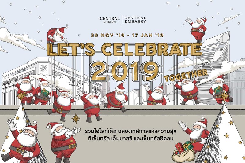 มาฉลองเทศกาลแห่งความสุขด้วยกันกับ “Let’s Celebrate 2019 Together” ยิ่งใหญ่กว่าครั้งไหน ๆ กับไฮไลต์สุดพิเศษ ซานต้าที่ใหญ่ที่สุดในเอเชียตะวันออกเฉียงใต้ถึง 2 ตัว และกองทัพมินิซานต้านับร้อย พร้อมกดซัตเตอร์รัว ๆ ไปกับค่ำคืนของแสงไฟประดับกว่าล้านดวง และต้นคริสต์มาสสูงที่สุดในกรุงเทพฯ ! ตั้งแต่วันที่ 30 พฤศจิกายน 2561 - 17 มกราคม 2562 ที่เซ็นทรัล เอ็มบาสซี และเซ็นทรัลชิดลม ดูรายละเอียดเพิ่มเติมได้ที่ เฟซบุ๊ก CENTRAL EMBASSY