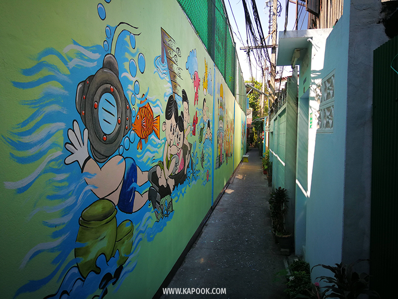 บริเวณเดียวกันจะมี 3 แยกให้เลี้ยวขวาไปตามทาง จากนั้นเลี้ยวซ้าย จะพบจุดเช็กอินที่ 2 จุดนี้จะเป็นภาพวาดศิลปะบนกำแพง Graffiti แสดงวิถีชิวิตดั้งเดิมของคนในชุมชน