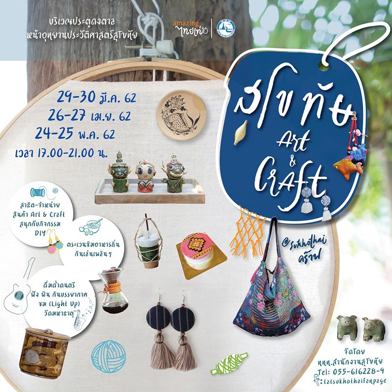 การท่องเที่ยวแห่งประเทศไทย ขอเชิญชวนร่วมงานสุโขทัย อาร์ต แอนด์ คราฟต์ (Sukhothai Art and Craft) ชมการสาธิตการทำสินค้าแฮนด์เมดจากชาวสุโขทัย พร้อมเลือกซื้อสินค้างานศิลปะทำมือสวย ๆ มากมาย ณ บริเวณประตูดงตาล หน้าอุทยานประวัติศาสตร์สุโขทัย ในวันที่ 29-30 มีนาคม, 26-27 เมษายน และ 24-25 พฤษภาคม 2562