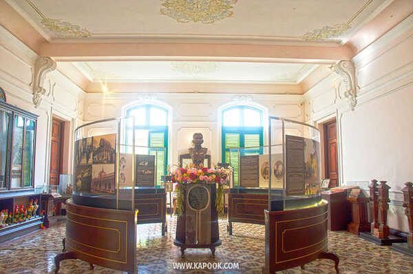 ตัวอาคารมีสถาปัตยกรรมแบบบารอคสีเหลืองสดใส ตัดลายเส้นขอบหน้าต่างและบานหน้าต่างด้วยสีเขียว มีมุขยื่นออกมาตรงกลาง ประดับประดารอบอาคารด้วยปูนปั้นลวดลายสวยงามวิจิตรบรรจง มีทั้งหมด 2 ชั้น ชั้นล่างปีกซ้าย (หันหน้าเข้าหาอาคาร) จัดแสดงประวัติของเจ้าพระยาอภัยภูเบศร (ชุ่ม อภัยวงศ์) และตึกเจ้าพระยาอภัยภูเบศร ส่วนปีกขวาจัดเป็นร้านค้าจำหน่ายผลิตภัณฑ์สมุนไพรอภัยภูเบศรและตู้เก็บยา ชั้นที่ 2 จัดแสดงกรรมวิธีการปรุงยาแผนไทย 28 วิธี มีตู้เก็บสมุนไพร ครกบดยา รางบดยา หินฝนยา ตลอดจนตำรายาไทยให้ได้ชมกัน