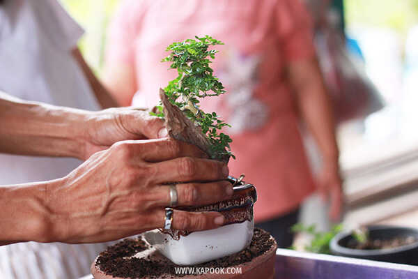 เรามุ่งหน้าไปกันที่บ้านของคุณทอม ศรีสุข ซึ่งเป็นเจ้าของสวนบอนไซที่มีชื่อเสียงของบ้านดงบัง ที่นี่มีต้นไม้หลากหลายชนิดให้เราเดินเที่ยวชม คุณทอมบอกว่าบอนไซที่นี่มีตั้งแต่ราคาหลักร้อย ไปจนถึงหลักแสนบาท ซึ่งราคาถูกกว่าที่อื่นแน่นอน โอ้ว...ใครที่ชอบบอนไซไม่ควรพลาดเลยนะเนี่ย และคุณทอมยังบอกอีกว่านักท่องเที่ยวที่สนใจสามารถเข้ามาเยี่ยมชมกันได้เลยถึงที่บ้าน และถ้าหากอยากจะทำสวนถาดมะสังดัดด้วยตัวเอง ก็สามารถทำได้ มีอุปกรณ์ให้พร้อม เพียงชุดละ 150 บาท เท่านั้น งานนี้เราก็เลยต้องลองค่ะ