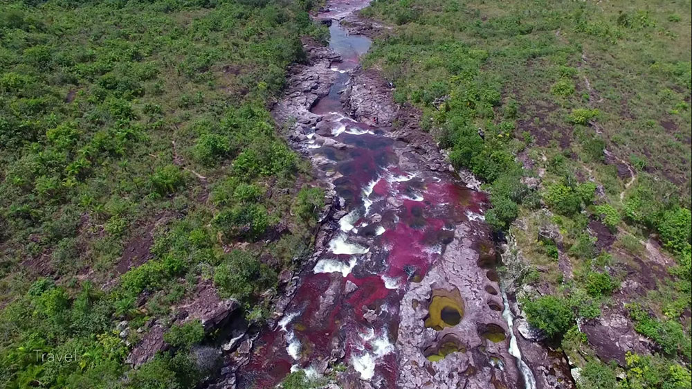สีต่าง ๆ ที่เกิดขึ้นนั้น เป็นสีของพืชใต้น้ำท้องถิ่น ที่มีชื่อว่า Macarenia clavigera บางช่วงก็จะเห็นเป็นสีเหลือง เขียว น้ำเงิน ดำ และแดง โดยจะเห็นปรากฏการณ์ดังกล่าวได้งดงามเพียงช่วงเวลาหนึ่งของปีเท่านั้น คือในช่วงปลายเดือนกรกฎาคม-พฤศจิกายน และต้องขึ้นอยู่กับปัจจัยอื่นร่วมด้วย ได้แก่ ระดับน้ำ และปริมาณแสงแดด หากเป็นช่วงเวลาที่เหมาะสม ก็จะได้สัมผัสความงามที่น่าตื่นตะลึง