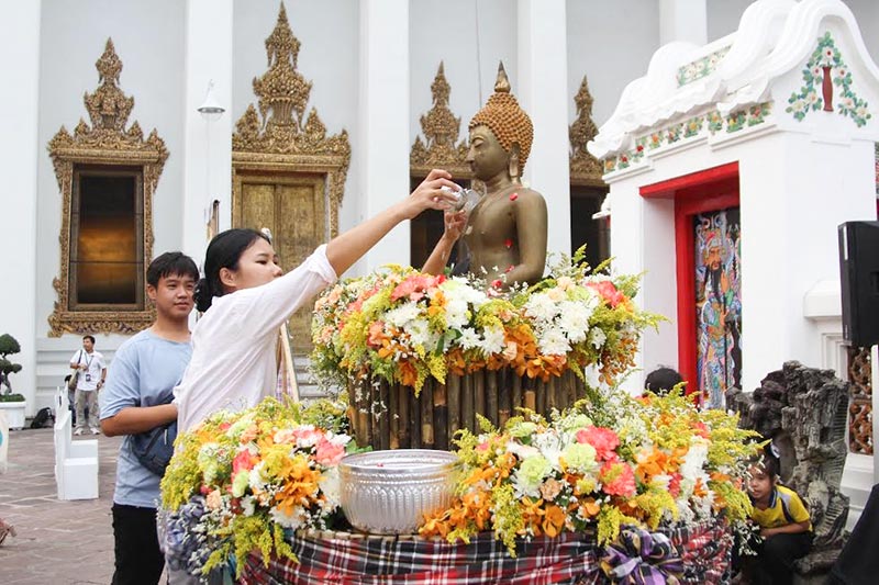 สักการะพระพุทธเทวปฏิมากร, พระพุทธไสยาสน์ กิจกรรมตั้งแต่เวลา 08.30-18.00 น. เย็นใจ Iconic, สรงน้ำพระประจำวันเกิด, ถวายสังฆทาน ผ้าไตร-จีวร, ซุ้มรดน้ำดำหัว, เวทีการแสดงวัฒนธรรมจากทางวัด และร้านค้าชุมชน ร้านค้าประชารัฐ