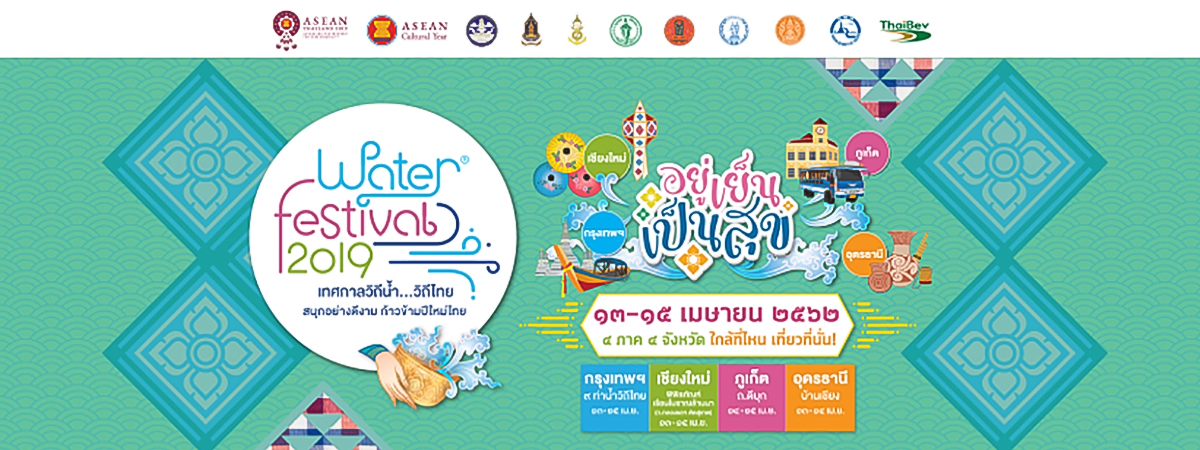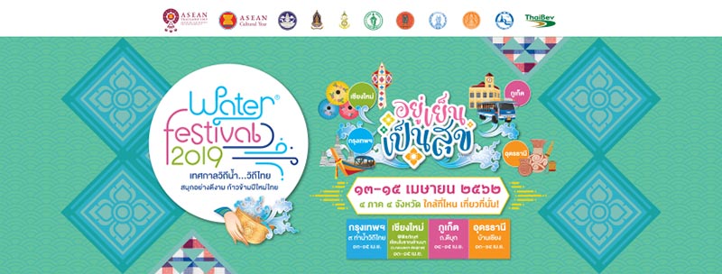 Water Festival 2019 เทศกาลวิถีน้ำ วิถีไทย ครั้งที่ 5 ภายใต้แนวคิด "อยู่เย็น เป็นสุข" กับมหกรรมความสนุกอย่างดีงาม ก้าวข้ามปีใหม่ไทย สุขกาย สุขใจ ตลอดปี 2562 กำหนดการจัดงานขึ้นทั้งหมด 4 ภาคของประเทศไทย ได้แก่ ภาคกลาง (กรุงเทพมหานคร) ภาคเหนือ (เชียงใหม่) ภาคตะวันออกเฉียงเหนือ (อุดรธานี) และภาคใต้ (ภูเก็ต) ร่วมสัมผัสกับมนตร์เสน่ห์แห่งวัฒนธรรมที่ผสานความร่วมสมัยอันดีงามที่สุดของประเทศไทย และต้อนรับปีวัฒนธรรมแห่งอาเซียน "ASEAN CULTURAL YEAR 2019"