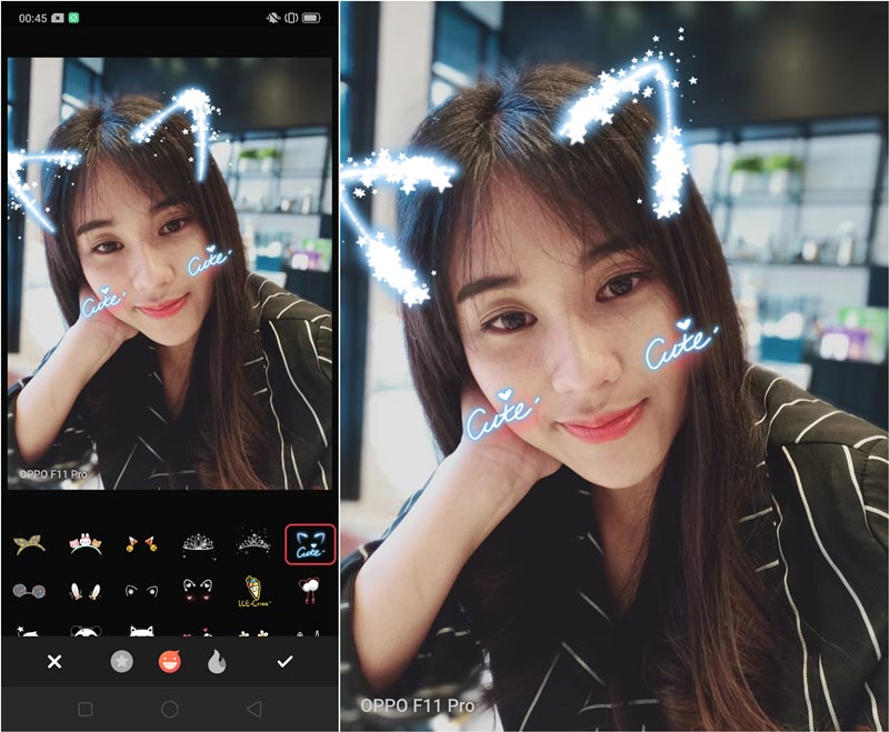 เซลฟี่เพียว ๆ อาจจะดูโล่งไปนิด OPPO F11 Pro ก็มีสติ๊กเกอร์ดุกดิกคิวต์ ๆ ไว้ให้แต่งรูป ขอลองเล่นดูหน่อยแล้วกัน