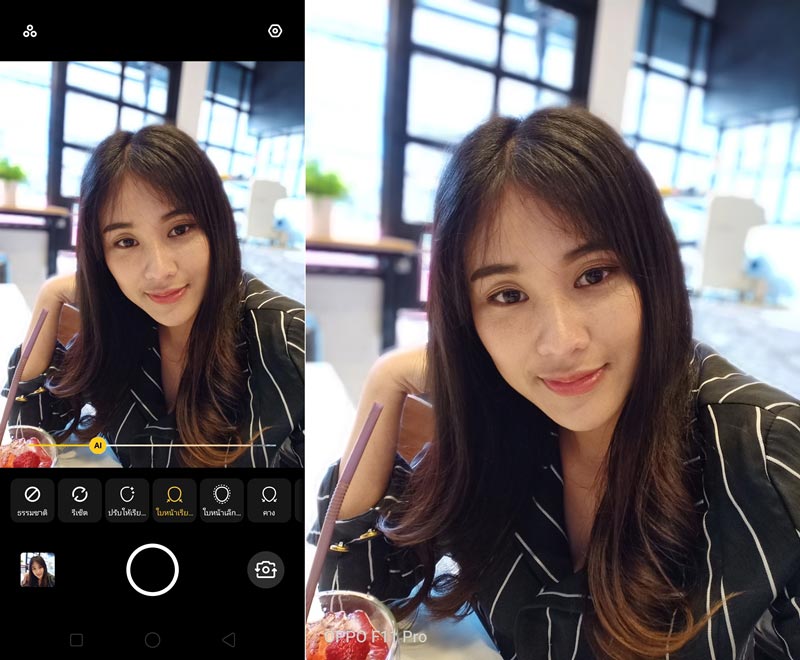 จริง ๆ ก่อนจะเดินทางกันวันนี้แอบนั่งเล่นเซลฟี่ที่คาเฟ่เบา ๆ ระหว่างรอแดดร่มลมตก เพราะ Oppo F11 Pro มีอีกหนึ่งทีเด็ดคือ Rising Camera กล้องหน้าป๊อปอัพขอบคริสตัลโปร่งใส ความละเอียด 16 MP และรูรับแสง F2.0 ละลายฉากหลังพอดี แถมสไลด์ขึ้นมาอัตโนมัติรวดเร็วทันใจ ที่สำคัญยังมีเทคโนโลยี AI Beauty ช่วยจับโฟกัสใบหน้า วิเคราะห์ฉาก และปรับแสงสีให้เหมาะกับภาพโดยรวมด้วย