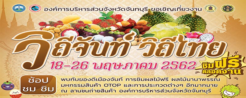 ชวนไปเที่ยวอิ่มจันทบุรี สนุกกับงานวิถีจันท์ วิถีไทย ของดีเมืองจันท์ วันผลไม้ ประจำปี 2562 ร่วมชิมลิ้มลองอาหารอร่อย ๆ ของเมืองจันท์ อีกทั้งผลไม้ไทยอร่อย ๆ สด ๆ ส่งตรงจากสวน พร้อมด้วยกิจกรรมสนุกอีกมากมาย