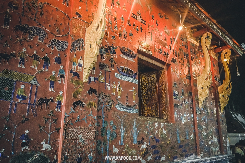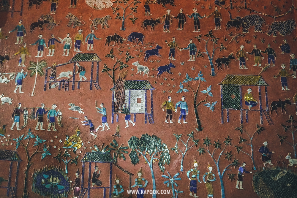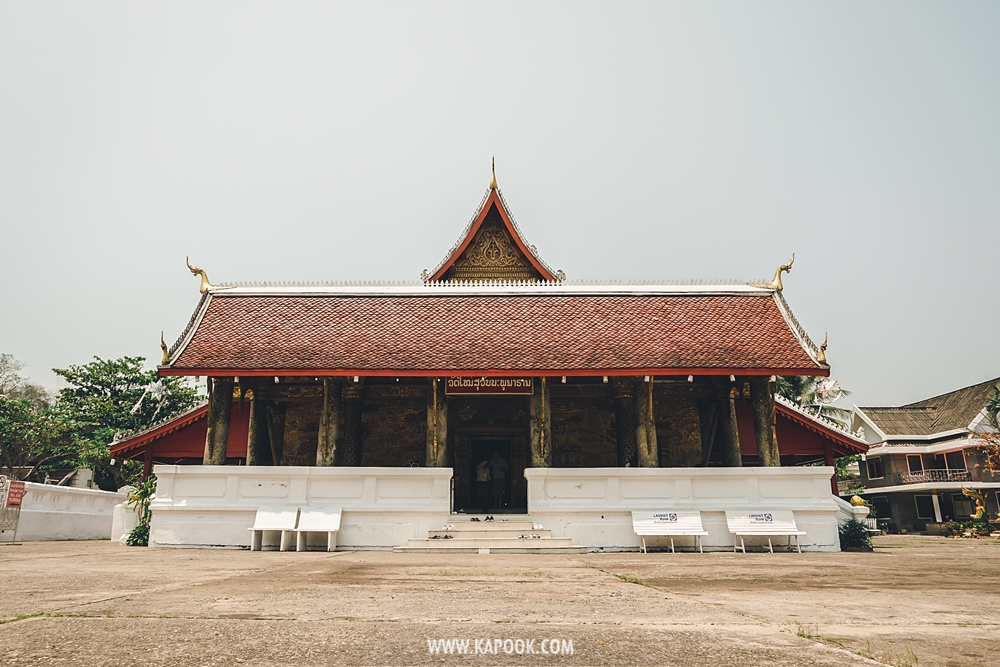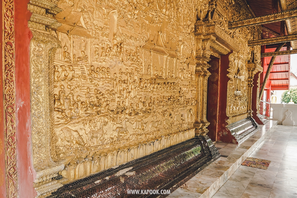 เดินเข้าไปด้านหน้าพระอุโบสถจะเห็นกำแพงที่มีภาพลงรักปิดทองเต็มผนัง เหลืองทองอร่าม ดูอลังการมาก พอหันมาที่เสาด้านหน้าก็ประดับประดาลงรักปิดทองด้วย ที่นี่สามารถเที่ยวชมได้ทุกวัน ตั้งแต่เวลา 08.00-17.00 น. ค่าเข้าชม 10,000 กีบ/คน แต่งกายสุภาพด้วยนะ