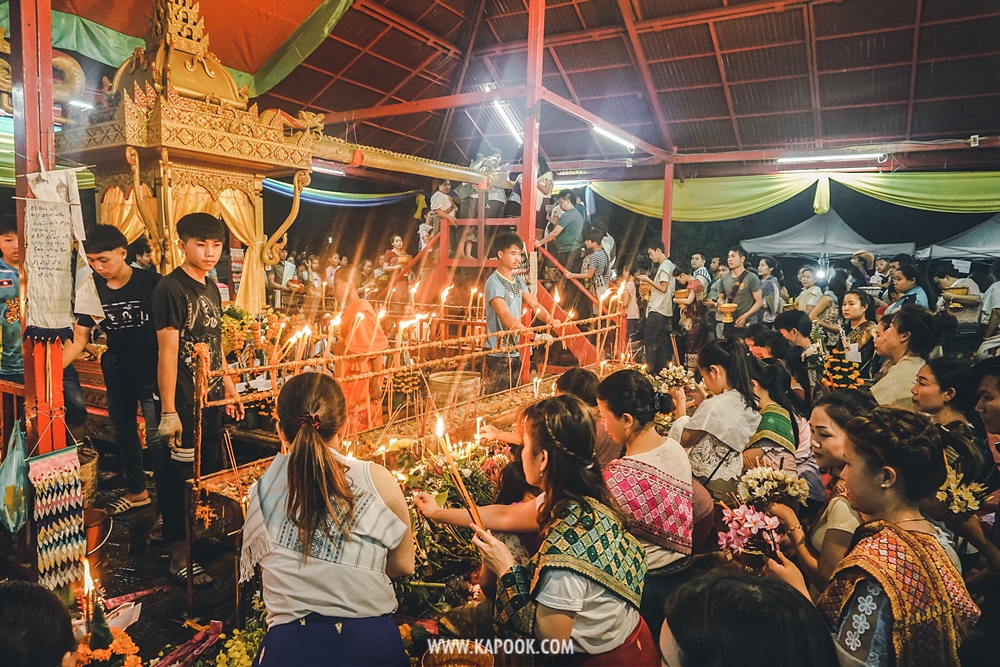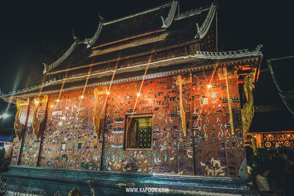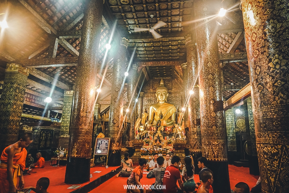 วันที่เราไปเยี่ยมชมวัดตรงกับช่วงสงกรานต์ของหลวงพระบางพอดี ซึ่งทางวัดจะอัญเชิญ “พระม่าน” ออกมาให้ชาวบ้านได้มาสรงน้ำพระกัน 1 ปีมีครั้งเดียวเท่านั้น โชคดีมาก ๆ ที่ได้มาคืนสุดท้ายของเทศกาล เลยได้สรงน้ำพระและมีโอกาสได้เห็นความงดงามของพระพุทธรูปสมัยล้านช้าง พร้อมกับได้เที่ยวชมวัดในยามค่ำคืน ได้มีโอกาสเข้าไปชมความสวยงามของ “พระองค์หลวง” พระประธานสีทองงามอร่ามตาภายในพระอุโบสถ