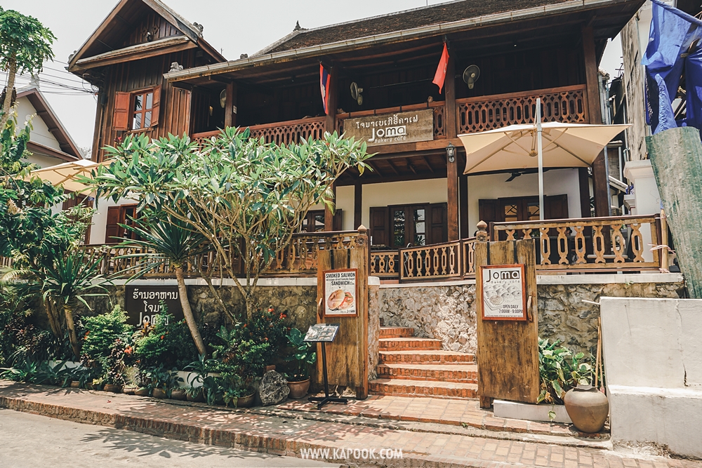 ร้านกาแฟที่มีชื่อเสียงของหลวงพระบาง โดยปกติแล้วเราจะได้เห็นร้านโจมาบนถนนเจ้าฟ้างุ้ม ใกล้กับไปรษณีย์หลวงพระบาง แต่ครั้งนี้เราได้ลองไปเยือนสาขาน้ำคาน บรรยากาศดีไม่แพ้กันเลย เป็นอาคารไม้สวยงาม มี 2 ชั้น เปิดโล่งกว้าง สามารถมองเห็นวิวแม่น้ำคานได้ด้วย