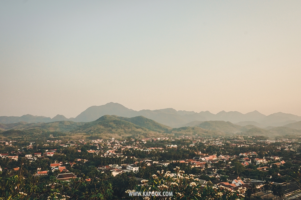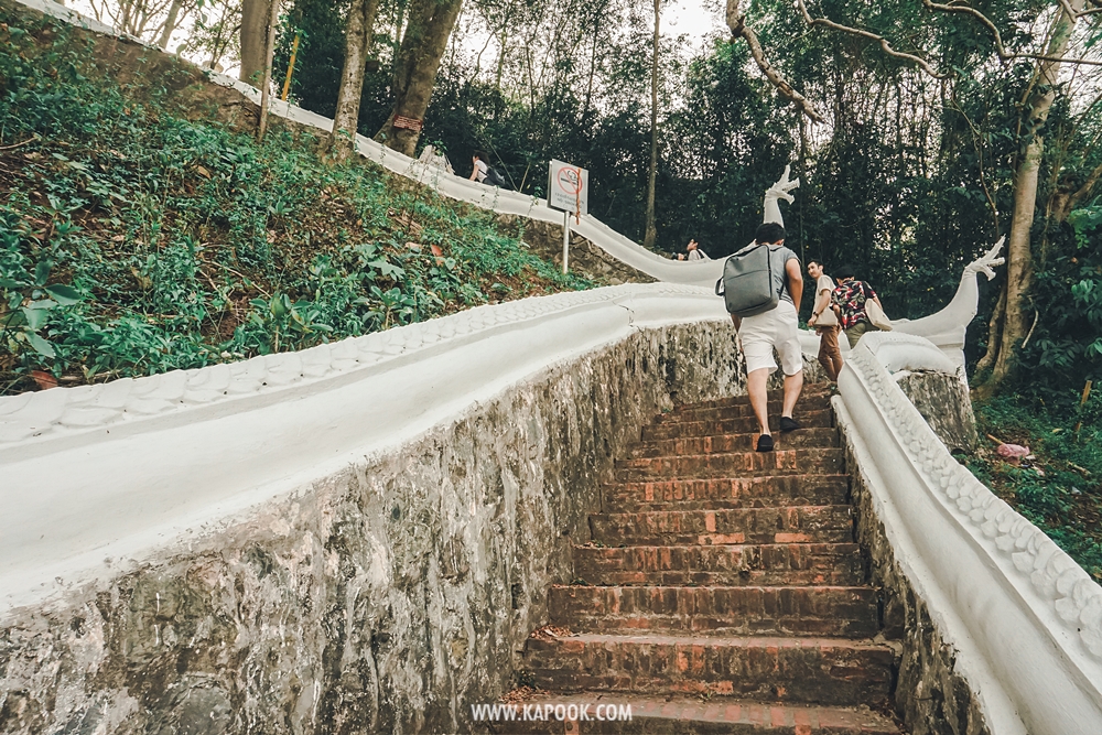 สถานที่ท่องเที่ยวห้ามพลาดอีกแห่งของหลวงพระบาง จริง ๆ ที่นี่ไม่มีอยู่ในแผนเที่ยวครั้งนี้ เพราะเวลาน้อย แต่เป็นความบังเอิญมาก ๆ ที่ไปเดินเที่ยวแถวเมืองเก่า แล้วเห็นทางขึ้นอยู่ใกล้แค่เอื้อม ลากขายาว ๆ รีบวิ่งวนขึ้นไปด้านบน ผ่านความทรมานของบันได 328 ขั้น เหนื่อยหอบเลยล่ะ แต่ก็คุ้มค่ามาก เพราะวิวด้านบนมันสวยจนลืมความเหนื่อยไปเลย
