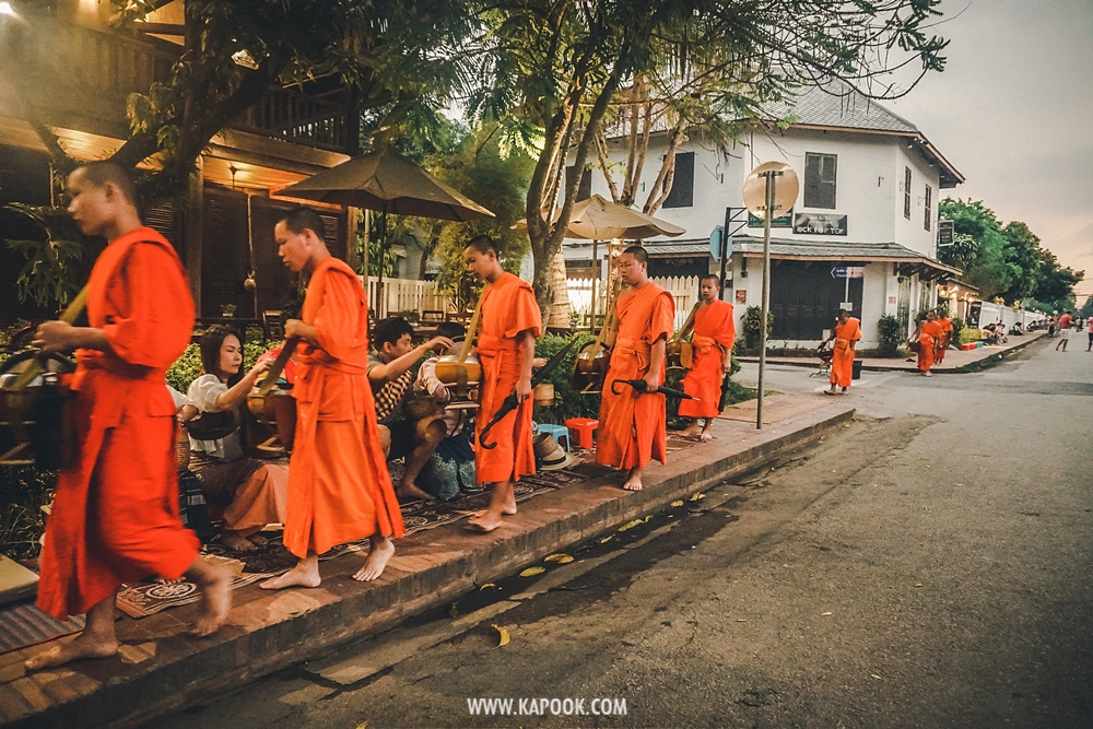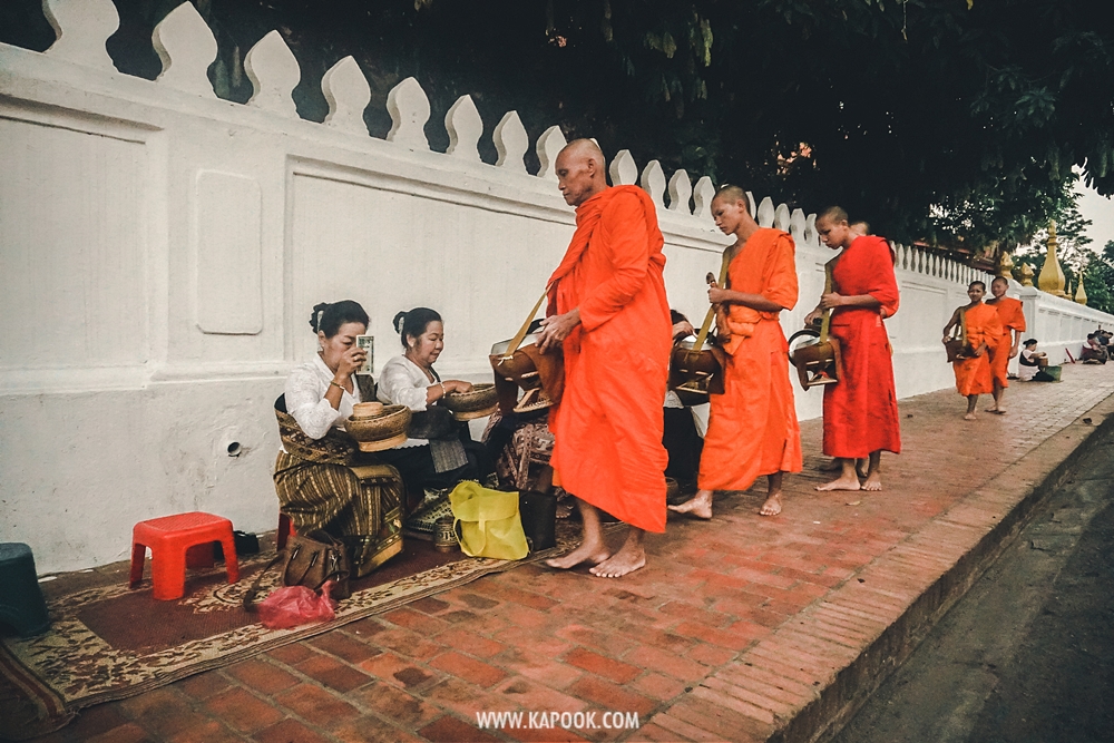ทริปนี้แอบใจแป้วหน่อย ๆ กลัวว่าจะไม่ได้ใส่บาตรเสียแล้ว เพราะฝนตกตอนเช้าทุกวัน แต่สุดท้ายก็ได้ไปใส่บาตรในวันสุดท้าย ฝนตกปรอย ๆ อากาศเย็น ๆ กำลังดี พระสงฆ์จะออกบิณฑบาตในช่วงราว ๆ 05.30 น. ชาวบ้านจะออกมานั่งรอเรียงแถวสวยงาม ถ้าเป็นผู้ใหญ่ ก็จะแต่งกายด้วยชุดพื้นเมือง ผู้หญิงนุ่งซิ่น สวมเสื้อสีขาว ห่มสไบ ผู้ชายก็แต่งกายสุภาพ ห่มสไบเช่นกัน