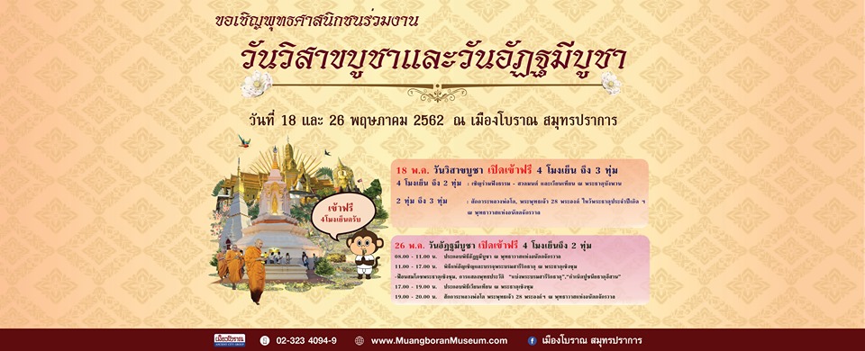 ขอเชิญร่วมงานวันวิสาขบูชาและวันอัฏฐมีบูชา ณ เมืองโบราณ จังหวัดสมุทรปราการ ในวันที่ 18 พฤษภาคม เปิดเข้าฟรีวันวิสาขบูชาตั้งแต่เวลา 16.00 น.