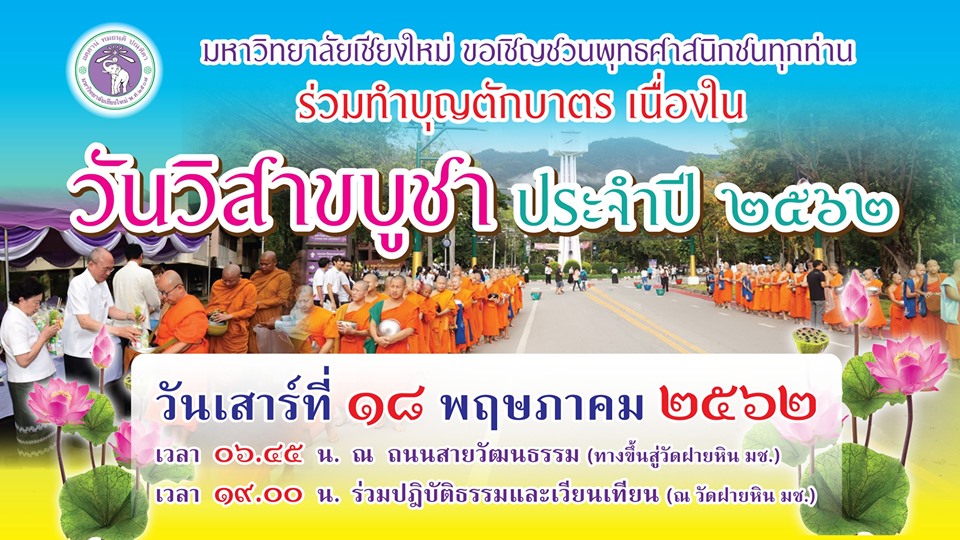 ขอเชิญร่วมทำบุญตักบาตร เนื่องในวันวิสาขบูชา ณ ถนนสายวัฒนธรรม (ถนนขึ้นสู่วัดฝายหิน) มหาวิทยาลัยเชียงใหม่ วันในวันที่ 18 พฤษภาคม