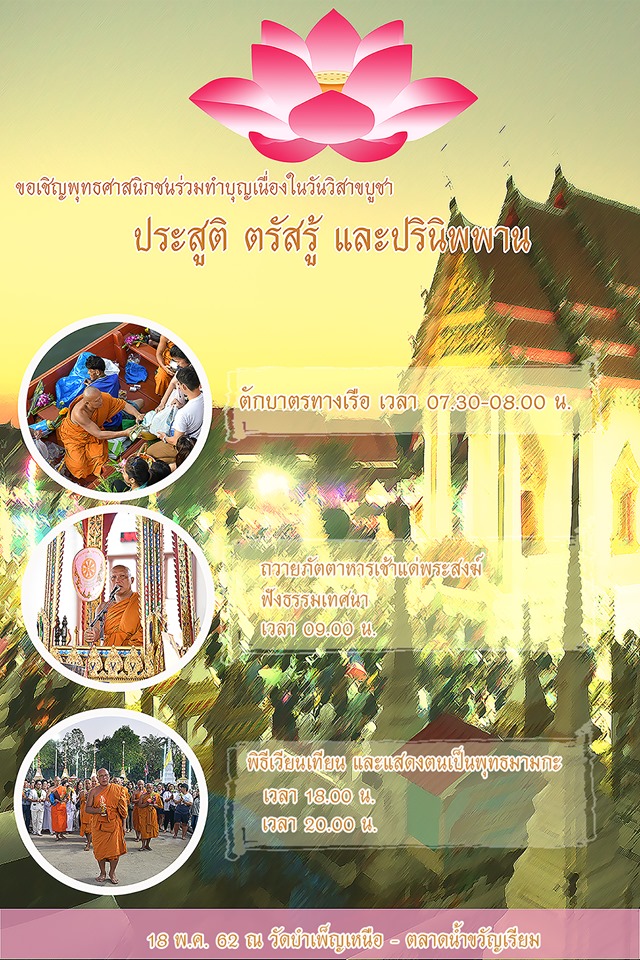 ขอเชิญร่วมงานวันวิสาขบูชา 2562 ณ วัดบำเพ็ญเหนือ-ตลาดน้ำขวัญเรียม ในวันที่ 18 พฤษภาคม เริ่มตั้งแต่เวลา 07.30 น. เป็นต้นไป