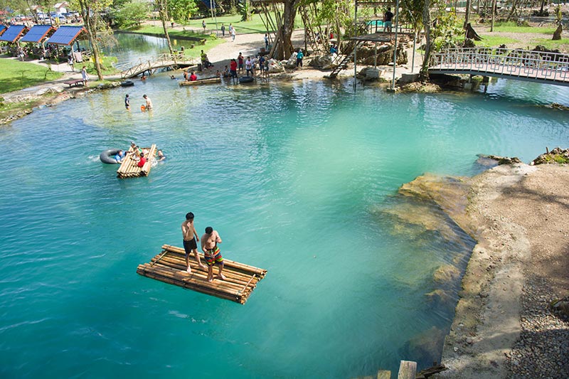 ที่เที่ยวธรรมชาติที่มีชื่อเสียงมากที่สุดของวังเวียง ปัจจุบันมีอยู่ด้วยกัน 3 แห่ง ซึ่งทั้งหมดมีลักษณะเป็นบ่อน้ำผุด โดยน้ำในบ่อจะเป็นสีฟ้าสวยใสเย็นฉ่ำ เนื่องจากผุดขึ้นมาจากชั้นหินด้านล่างไหลเรื่อยผ่านดินและหินขึ้นมาเรื่อย ๆ จึงทำให้น้ำใส เมื่อผสมกับแร่ธาตุบางอย่างจึงทำให้มีสีฟ้า ซึ่งนักท่องเที่ยวสามารถที่จะลงไปเล่นน้ำได้ มีทั้งชิงช้า แพไม้ไผ่ เชือกให้กระโดดน้ำ พร้อมกับมีเสื้อชูชีพไว้บริการ