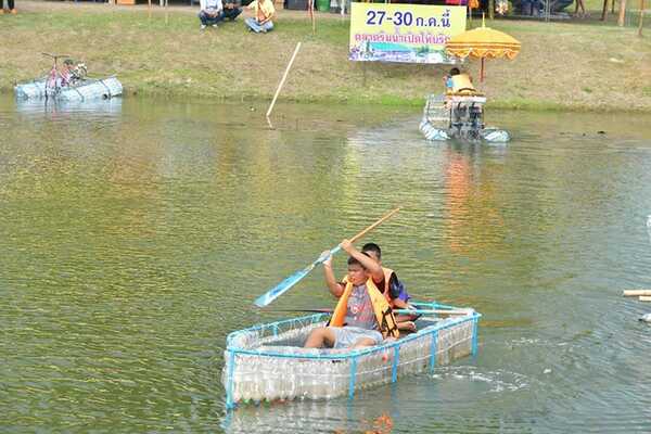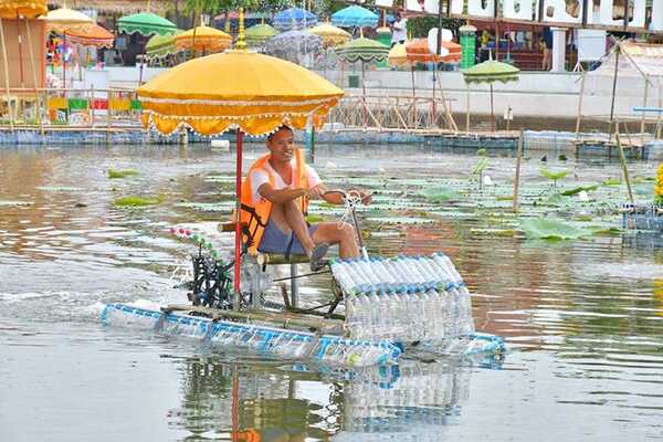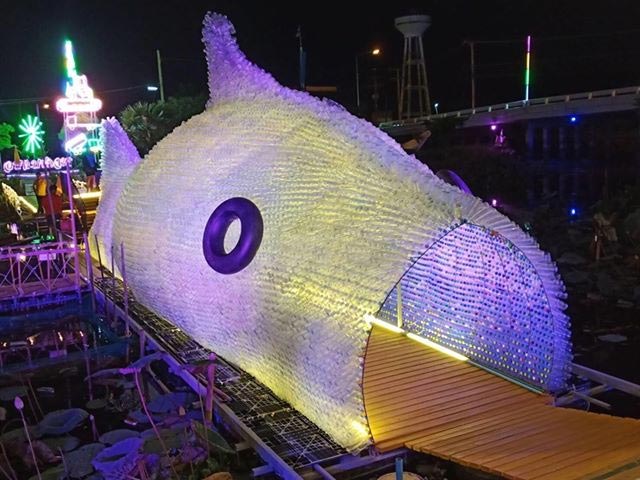 และอีกหนึ่งความพิเศษที่เรียกร้องความสนใจให้กับคนที่มาเดินเที่ยวตลาดอยู่ไม่น้อย เห็นจะเป็น “ปลาตะเพียนทองยักษ์” ที่สร้างขึ้นจากขวดน้ำพลาสติกเช่นกัน และเพราะด้วยขนาดความใหญ่ทำให้นักท่องเที่ยวสามารถเดินลอดซุ้มปลาตะเพียนยักษ์ ยิ่งถ้าไปช่วงกลางคืนจะมีการเปิดไฟประดับสวยงามตา เชื้อเชิญให้เราถ่ายรูปกันแบบไม่รู้เบื่อ หรือถ้าใครอยากจะหาที่นั่งชิล บริเวณใกล้เคียงก็มีซุ้มโต๊ะที่เป็นแพหรือจะเป็นโต๊ะบนบกให้นั่งกินอาหารกันเพลิน ๆ เอาจริง ๆ แค่ไปเดินเล่นถ่ายรูปก็แฮปปี้แล้ว
