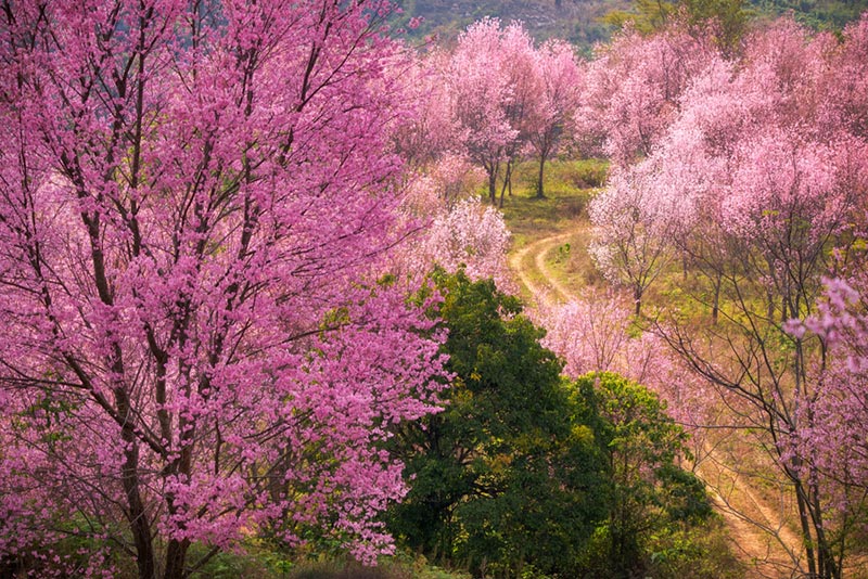 สถานที่ชมดอกซากุระที่ใหญ่ที่สุดในเมืองไทย ตั้งอยู่ในเขตอุทยานแห่งชาติภูหินร่องกล้า ตำบลกกสะทอน อำเภอด่านซ้าย จังหวัดเลย สูงประมาณ 1,500-1,664 เมตรจากระดับน้ำทะเล มีพื้นที่ปลูกต้นนางพญาเสือโคร่งมากกว่า 1,200 ไร่ โดยในช่วงเดือนมกราคมของทุกปี ดอกนางพญาเสือโคร่งจะพากันบานสะพรั่ง ส่งสีชมพูสวยหวานละลานตาไปทั่วทั้งยอดเขา สามารถติดตามการบานของดอกนางพญาเสือโคร่งได้ที่