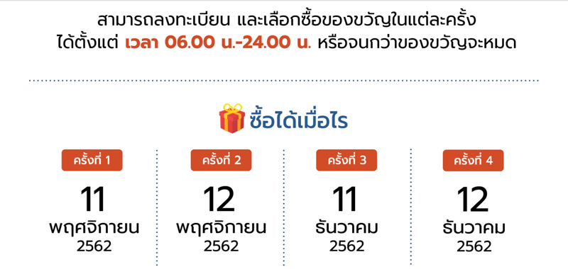 สามารถลงทะเบียน และเลือกซื้อของขวัญได้ในวันที่ 11-12 พฤศจิกายน และวันที่ 11-12 ธันวาคม 2562