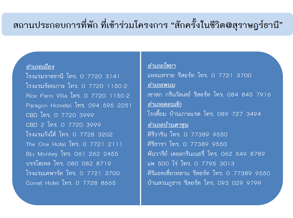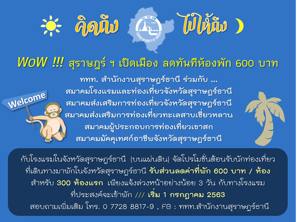 ทั้งนี้ สอบถามรายละเอียดเพิ่มเติมได้ที่ ททท. สำนักงานชุมพร โทรศัพท์ 077-502775