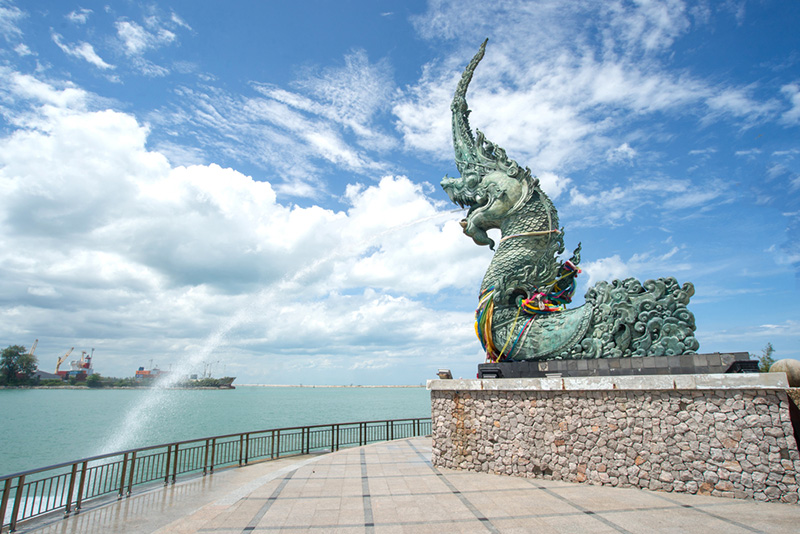 สวนสาธารณะขนาดใหญ่ที่มีวิวทิวทัศน์ริมฝั่งทะเลงดงาม พร้อมทั้งมีสิ่งที่น่าสนใจหลายอย่าง ตั้งอยู่บริเวณปากทะเสสาบสงขลา โดดเด่นด้วยประติมากรรมหัวพญานาคพ่นน้ำ สูงมากถึง 9 เมตร ออกแบบโดยอาจารย์มนตรี สังข์มุสิกานนท์ ซึ่งยังมีอีก 2 ส่วน ส่วนที่สองเป็นสะดือพญานาค ตั้งอยู่บริเวณลานชมดาว สนามสระบัว แหลมสมิหลา และส่วนหางพญานาค ตั้งอยู่บริเวณชายหาดสมิหลา ริมถนนสะเดา