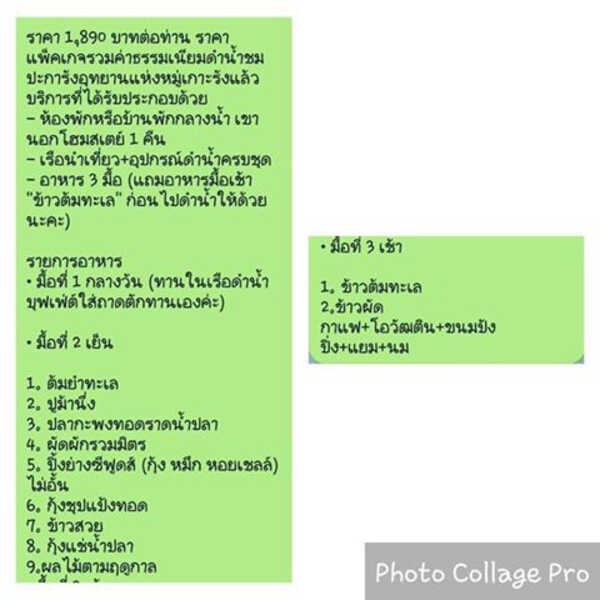 - 2 วัน 1 คืน คนละ 1,890 บาท อาหาร 4 มื้อ พร้อมกิจกรรมดำน้ำและตกหมึก