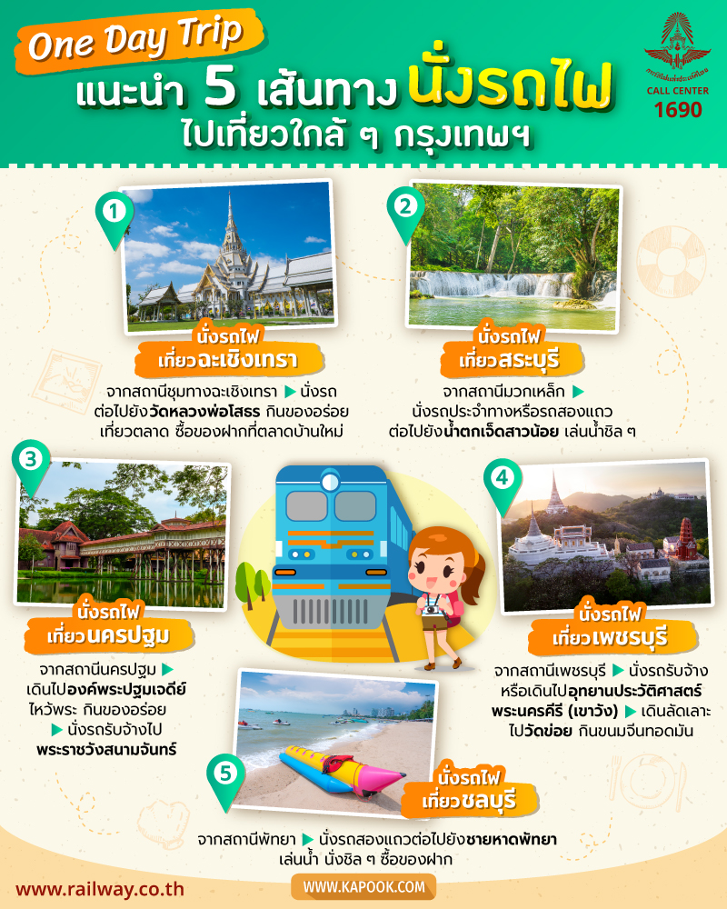 หากคุณมีเวลาว่าง 1 วัน และกำลังมองหาที่เที่ยวต่างจังหวัดใกล้ ๆ กรุงเทพฯ ในแบบราคาประหยัด สะดวก ปลอดภัย แล้วละก็ การนั่งรถไฟเที่ยวก็เป็นทางเลือกที่น่าสนใจไม่น้อยเลย วันนี้เราจึงขอนำเสนอเส้นทางท่องเที่ยวแบบฉบับ One Day Trip (วันเดย์ทริป) มาแนะนำกัน ซึ่งในแต่ละเส้นทางนั้น ก็อาจจะเหมาะกับกลุ่มแก๊งเพื่อนเดินทางที่ต่างกันออกไป ไม่ว่าจะเป็นเพื่อน คนรัก หรือครอบครัว ส่วนจะมีที่ไหนบ้างนั้น ตามไปเที่ยวกันเลย