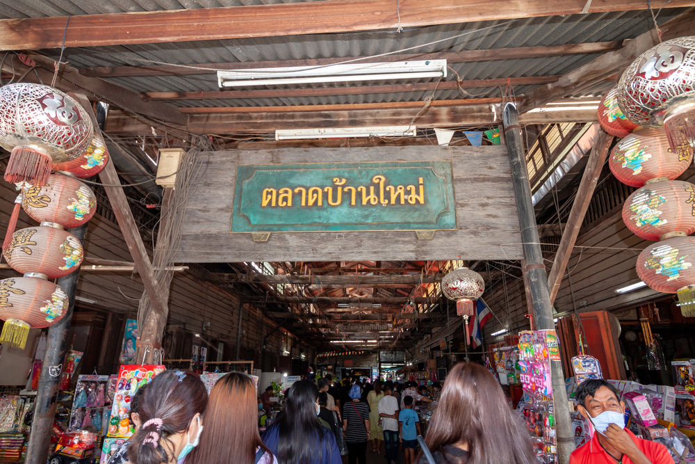 กินอิ่มแล้วก็ได้เวลาย่อยสักหน่อย ด้วยการไปเดินเที่ยวตลาดบ้านใหม่ ที่ตั้งอยู่ห่างจากวัดไปประมาณ 5 กิโลเมตรเท่านั้น โดยขึ้นรถสองแถวสีเหลืองไปขนส่ง จากนั้นต่อรถสองแถวสีขาวแถบเหลืองไปตลาดได้เลย สำหรับตลาดแห่งนี้เป็นตลาดโบราณริมฝั่งแม่น้ำบางปะกงอายุกว่า 100 ปี แวดล้อมด้วยอาคารบ้านเรือนเก่าแก่ ภายในตลาดจะมีสินค้าจำหน่ายมากมาย ทั้งอาหาร ขนมไทย เครื่องดื่มโบราณ สมุนไพร ของเล่นโบราณ และของที่ระลึกต่าง ๆ แถมยังมีศาลาริมน้ำให้นั่งพักด้วย