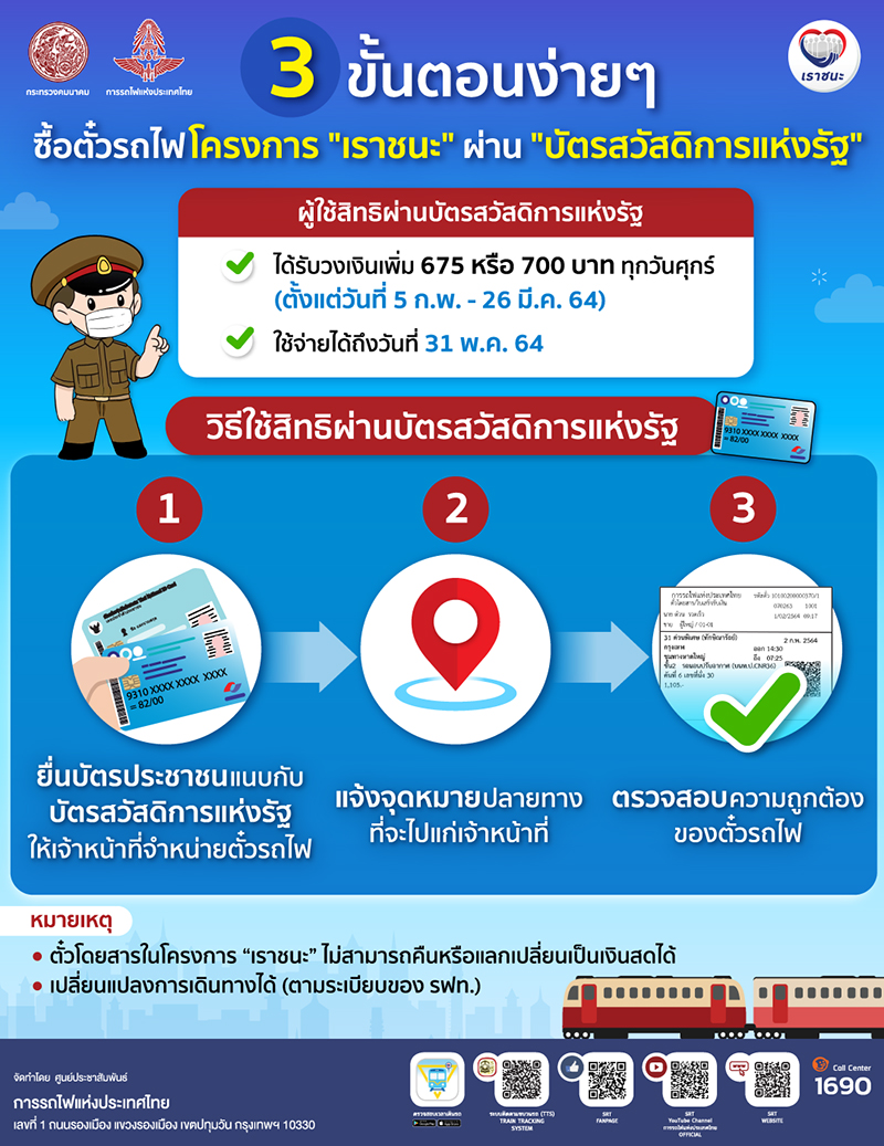 การรถไฟฯ เดินหน้าอำนวยความสะดวกให้ประชาชน โดยเปิดให้ผู้ได้รับสิทธิโครงการเราชนะ สามารถซื้อตั๋วโดยสารผ่านแอปฯ เป๋าตัง และบัตรสวัสดิการแห่งรัฐ ได้ทุกสถานีทั่วประเทศ เริ่มแล้วตั้งแต่วันนี้ จนถึงวันที่ 31 พฤษภาคม 2564 ซึ่งหวังจะช่วยบรรเทาภาระค่าครองชีพการเดินทางแก่ประชาชน พร้อมกับส่งเสริมให้ผู้ใช้บริการเปลี่ยนวิธีชำระค่าโดยสารเป็นแบบไร้เงินสด เลี่ยงการสัมผัสเหรียญกษาปณ์และธนบัตร เพื่อลดความเสี่ยงในการแพร่ระบาดของเชื้อไวรัสโควิด 19