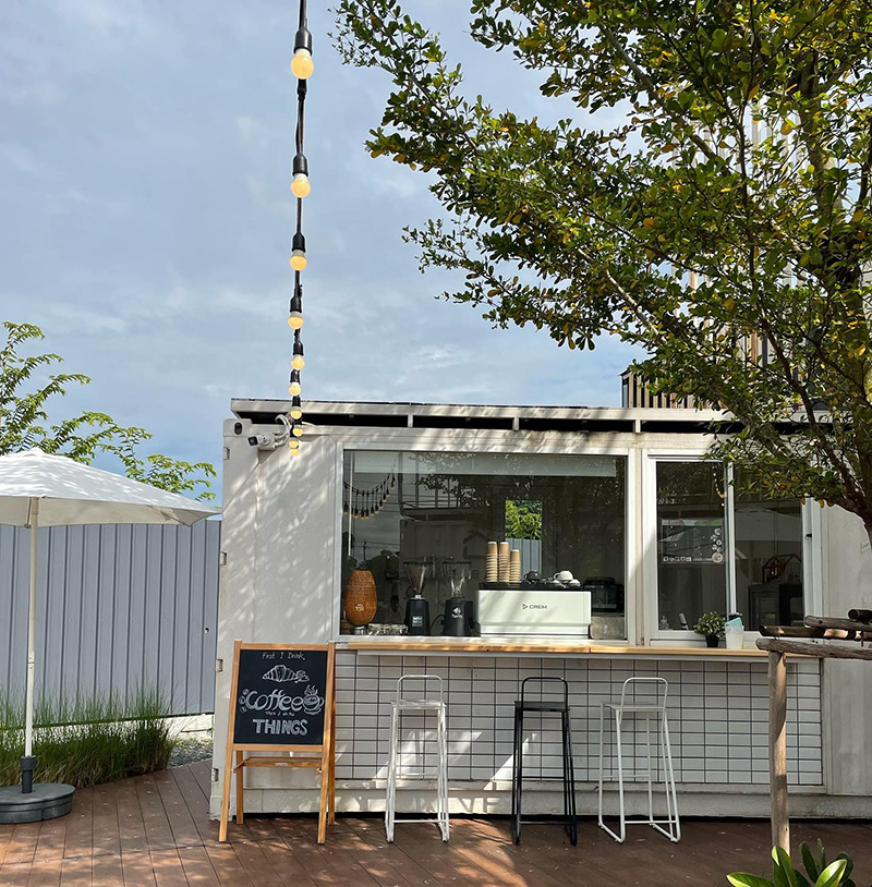 คาเฟ่ในซอยลาดกระบัง 54 มาในสไตล์โฮมมี่น่ารัก ๆ ทั้งยังล้อมรอบด้วยต้นไม้น้อยใหญ่ ช่วยทำให้บรรยากาศผ่อนยิ่งกว่าเดิม นอกจากนี้ยังมีเมล็ดกาแฟให้เลือกหลากหลาย ไม่ว่าจะเป็นสาย Drip หรือสาย Slowbar แต่ละแก้วชงออกมาได้อย่างละมุน นอกจากนี้ยังมีเมนูแนะนำต่าง ๆ ทั้งคาวและหวาน เช่น Orange Americano, Dirty, Latte, ปังนึ่งสังขยาใบเตย, สปาเกตตี คาโบนารา และซีซ่าสลัด เป็นต้น จัดไว้ให้ครบในที่เดียว